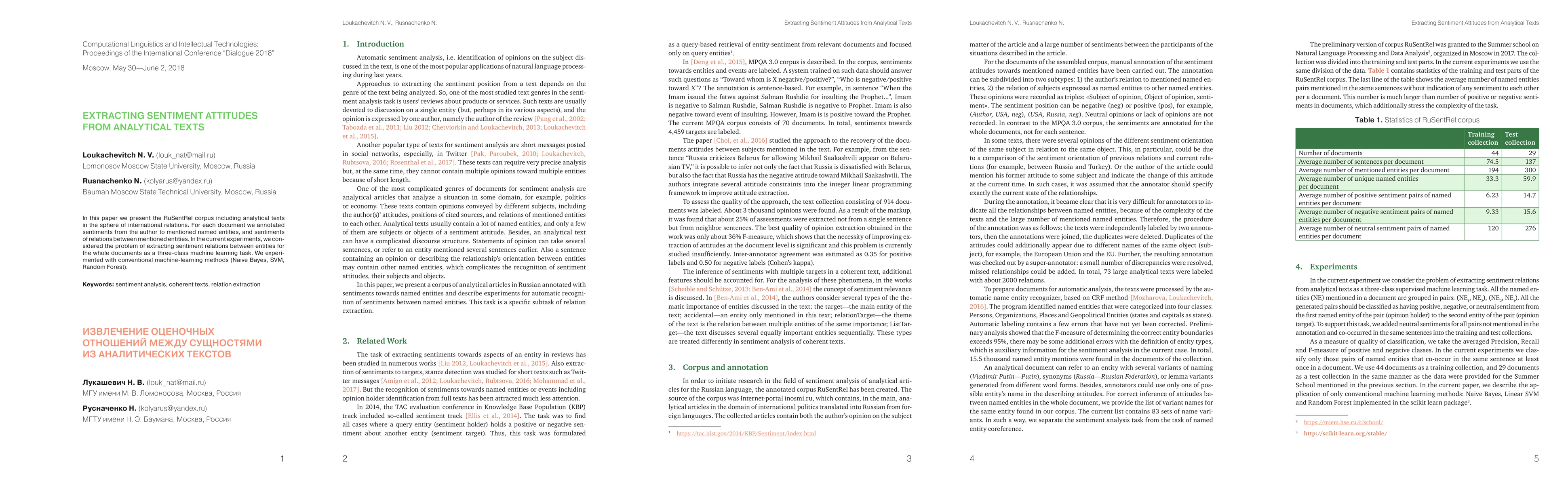 This paper presents a dataset (RuSentRel corpus) for extracting sentiment attitudes from analytical texts in international relations. It explores machine learning methods to determine sentiment relations between entities in documents.