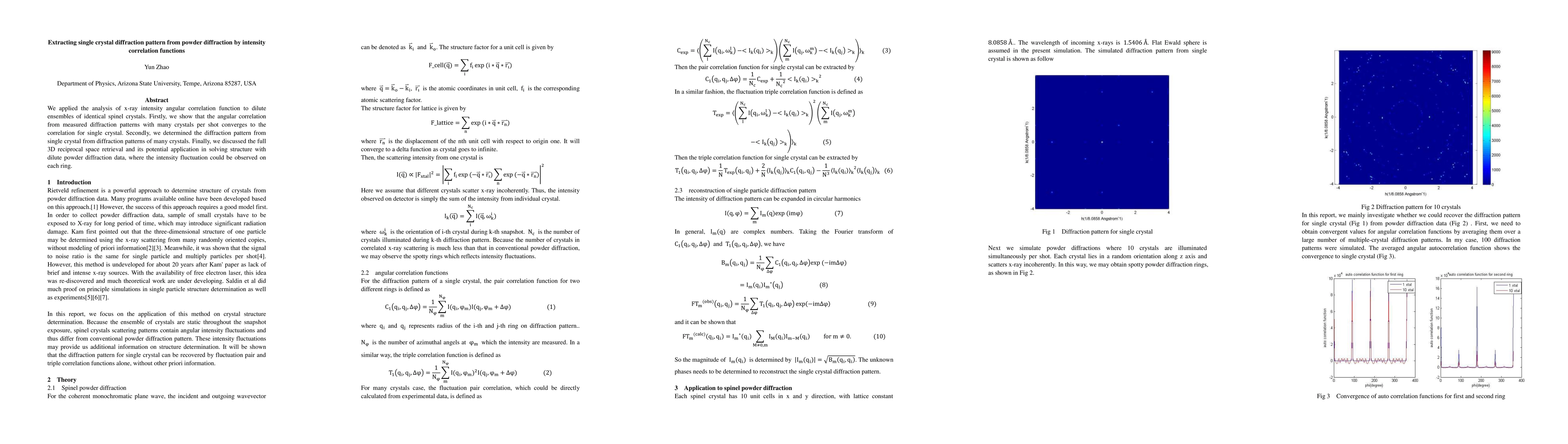 We applied the analysis of x-ray intensity angular correlation function to dilute ensembles of identical spinel crystals. Firstly, we show that the angular correlation from measured diffraction patterns with many crystals per shot converges to the correlation for single crystal. Secondly, we determined the diffraction pattern from single crystal from diffraction patterns of many crystals. Finally, we discussed the full 3D reciprocal space retrieval and its potential application in solving structure with dilute powder diffraction data, where the intensity fluctuation could be observed on each ring.