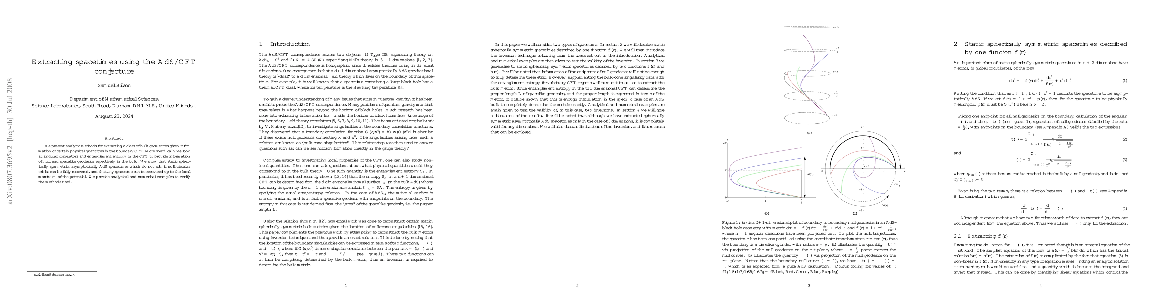 We present analytic methods for extracting a class of bulk geometries given information of certain physical quantities in the boundary CFT. More specifically we look at singular correlators and entanglement entropy in the CFT to provide information of null and spacelike geodesics repectively in the bulk. We show that static spherically symmetric, asymptotically AdS spacetimes which do not admit null circular orbits can be fully recovered, and that any spacetime can be recovered up to the local maximum of the potential. We provide analytical and numerical examples to verify the methods used.