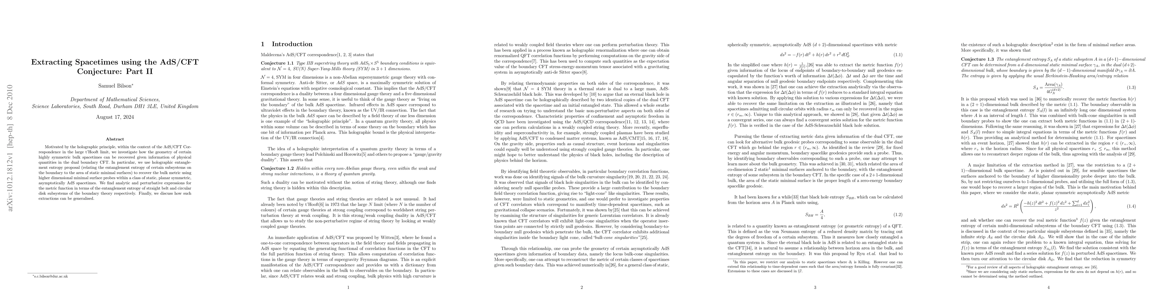 This paper explores the AdS/CFT Correspondence to extract the geometry of highly symmetric bulk spacetimes from boundary CFT data, using holographic entanglement entropy to relate boundary subsystem entropies to minimal surface areas. It derives analytic expressions for the bulk metric from entanglement entropy of specific boundary regions.