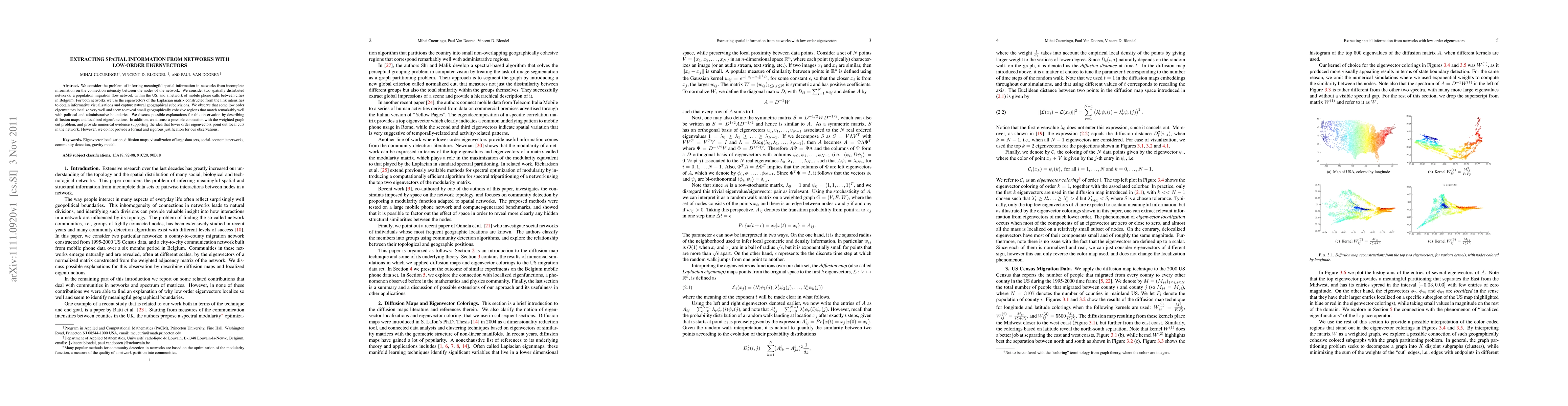 This paper explores inferring spatial information from networks using low-order eigenvectors of the Laplacian matrix, demonstrating successful localization in US migration and Belgian mobile phone call networks, revealing geographically cohesive regions. It discusses potential connections to the weighted graph cut problem but lacks a formal justification.