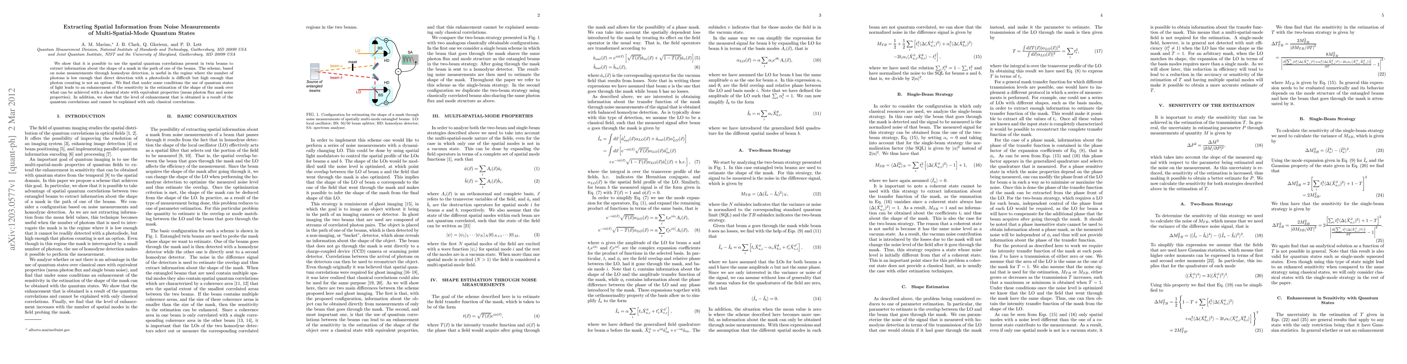 We show that it is possible to use the spatial quantum correlations present in twin beams to extract information about the shape of a mask in the path of one of the beams. The scheme, based on noise measurements through homodyne detection, is useful in the regime where the number of photons is low enough that direct detection with a photodiode is difficult but high enough that photon counting is not an option. We find that under some conditions the use of quantum states of light leads to an enhancement of the sensitivity in the estimation of the shape of the mask over what can be achieved with a classical state with equivalent properties (mean photon flux and noise properties). In addition, we show that the level of enhancement that is obtained is a result of the quantum correlations and cannot be explained with only classical correlations.