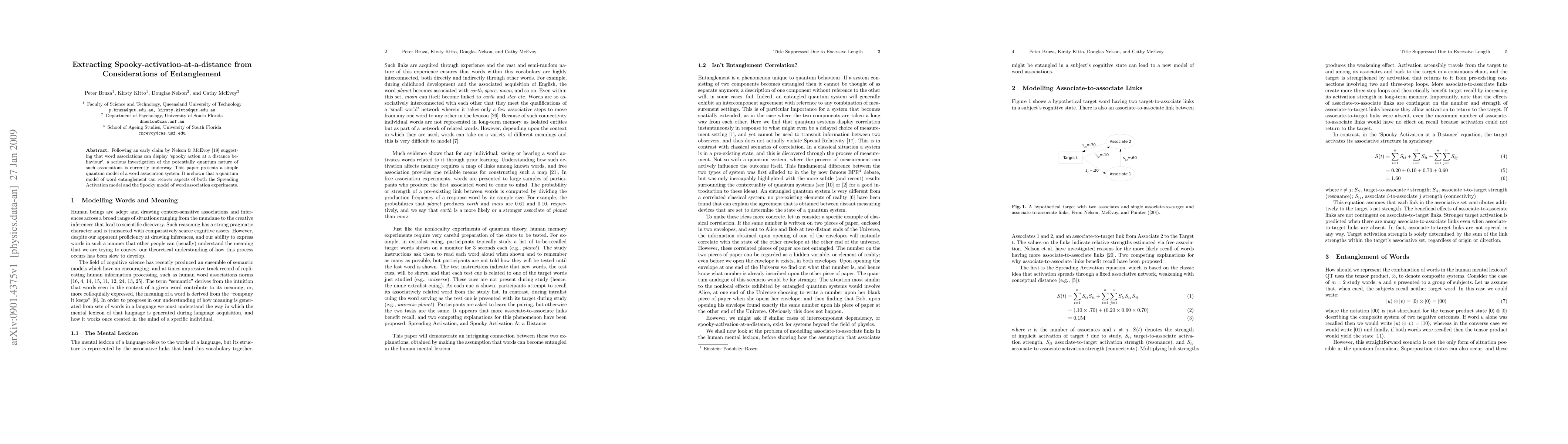 Following an early claim by Nelson & McEvoy \cite{Nelson:McEvoy:2007} suggesting that word associations can display `spooky action at a distance behaviour', a serious investigation of the potentially quantum nature of such associations is currently underway. This paper presents a simple quantum model of a word association system. It is shown that a quantum model of word entanglement can recover aspects of both the Spreading Activation equation and the Spooky-activation-at-a-distance equation, both of which are used to model the activation level of words in human memory.