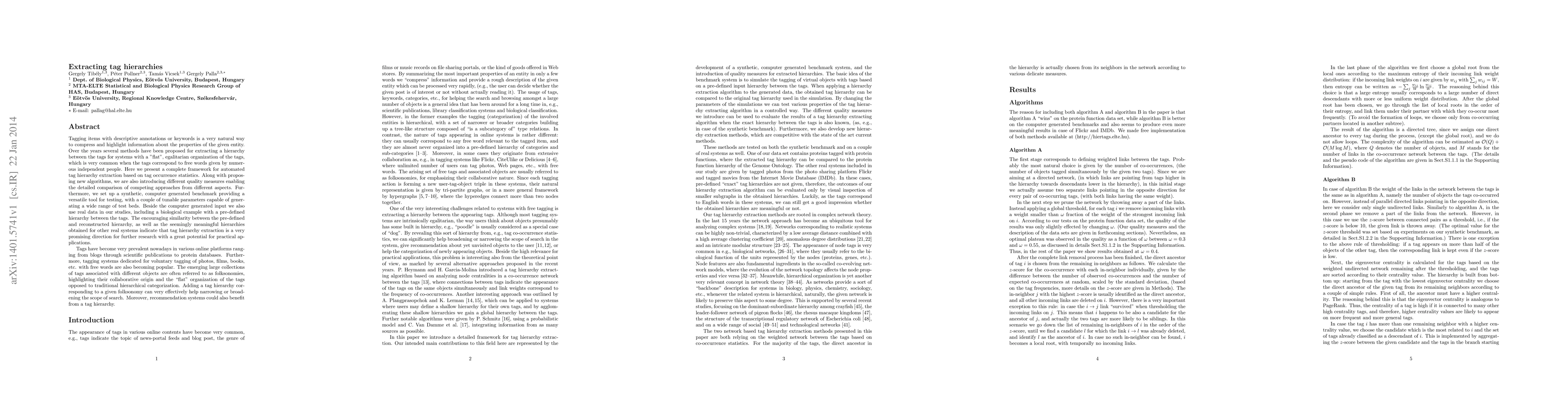 This paper presents a framework for automated extraction of tag hierarchies from free-form tags using occurrence statistics, introduces new algorithms and quality measures for comparison, and establishes a synthetic benchmark for testing. The promising results from both synthetic and real data suggest significant potential for practical applications in tag organization.