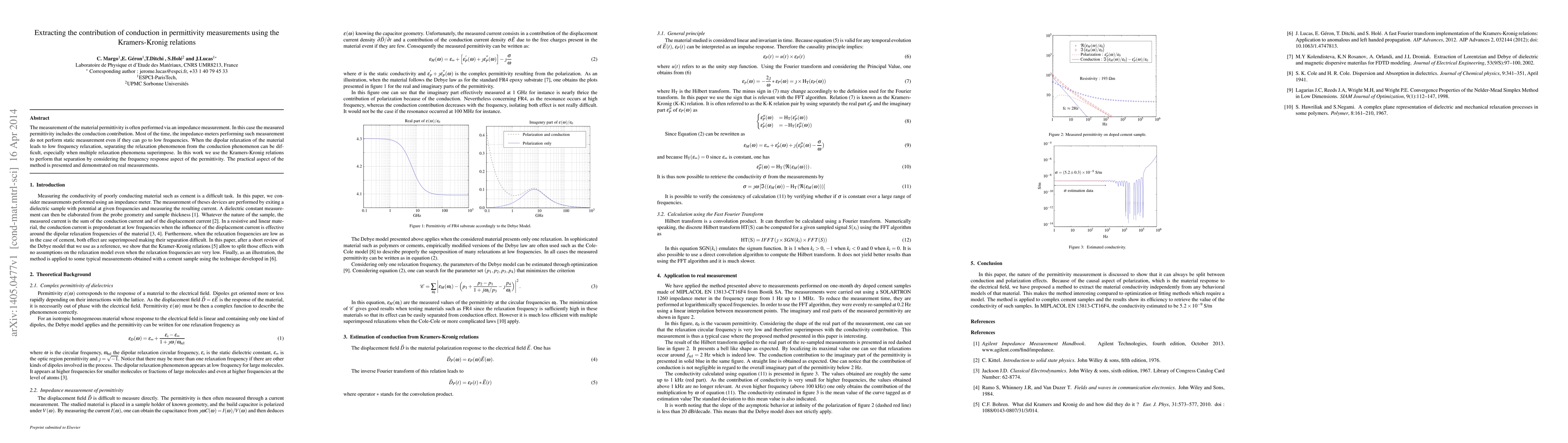 This paper proposes using the Kramers-Kronig relations to separate the conduction contribution from the permittivity measurements, which typically include both conduction and relaxation effects. The method is demonstrated on real data, showing its practical application in distinguishing relaxation phenomena from conduction.