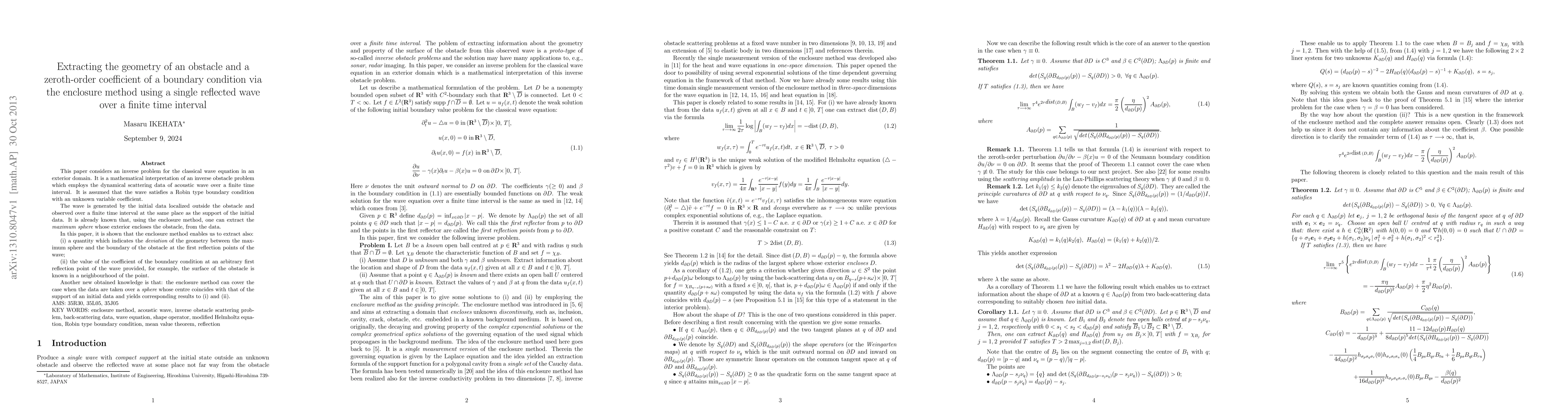 This paper presents an inverse problem solution for the classical wave equation using the enclosure method, extracting the geometry of an obstacle and the coefficient of a Robin boundary condition from acoustic wave scattering data over a finite time interval. The method also reveals the geometry deviation and boundary condition coefficient at first reflection points.