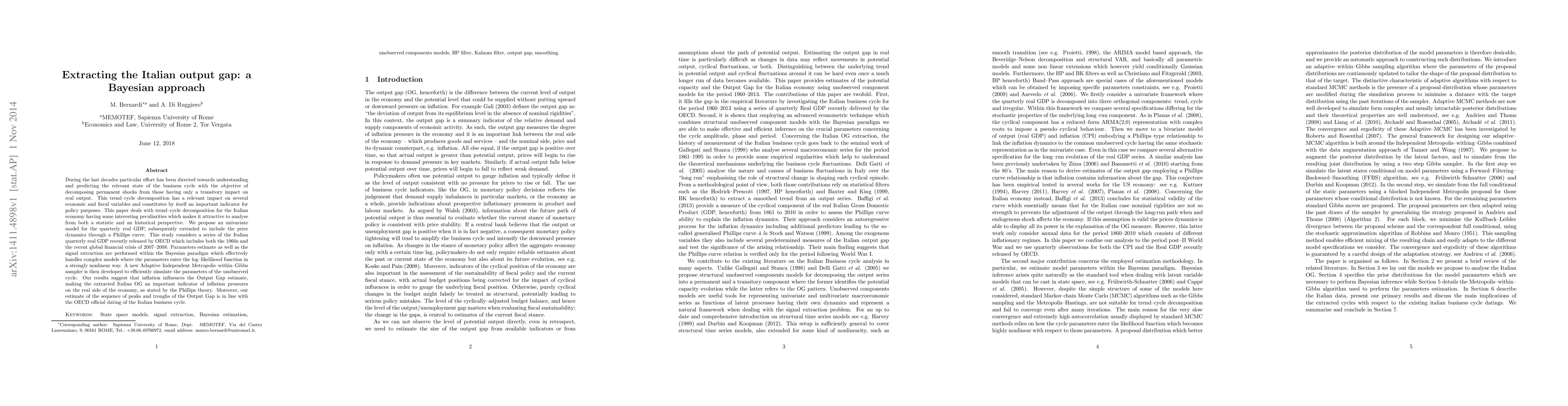 During the last decades particular effort has been directed towards understanding and predicting the relevant state of the business cycle with the objective of decomposing permanent shocks from those having only a transitory impact on real output. This trend--cycle decomposition has a relevant impact on several economic and fiscal variables and constitutes by itself an important indicator for policy purposes. This paper deals with trend--cycle decomposition for the Italian economy having some interesting peculiarities which makes it attractive to analyse from both a statistic and an historical perspective. We propose an univariate model for the quarterly real GDP, subsequently extended to include the price dynamics through a Phillips curve. This study considers a series of the Italian quarterly real GDP recently released by OECD which includes both the 1960s and the recent global financial crisis of 2007--2008. Parameters estimate as well as the signal extraction are performed within the Bayesian paradigm which effectively handles complex models where the parameters enter the log--likelihood function in a strongly nonlinear way. A new Adaptive Independent Metropolis--within--Gibbs sampler is then developed to efficiently simulate the parameters of the unobserved cycle. Our results suggest that inflation influences the Output Gap estimate, making the extracted Italian OG an important indicator of inflation pressures on the real side of the economy, as stated by the Phillips theory. Moreover, our estimate of the sequence of peaks and troughs of the Output Gap is in line with the OECD official dating of the Italian business cycle.