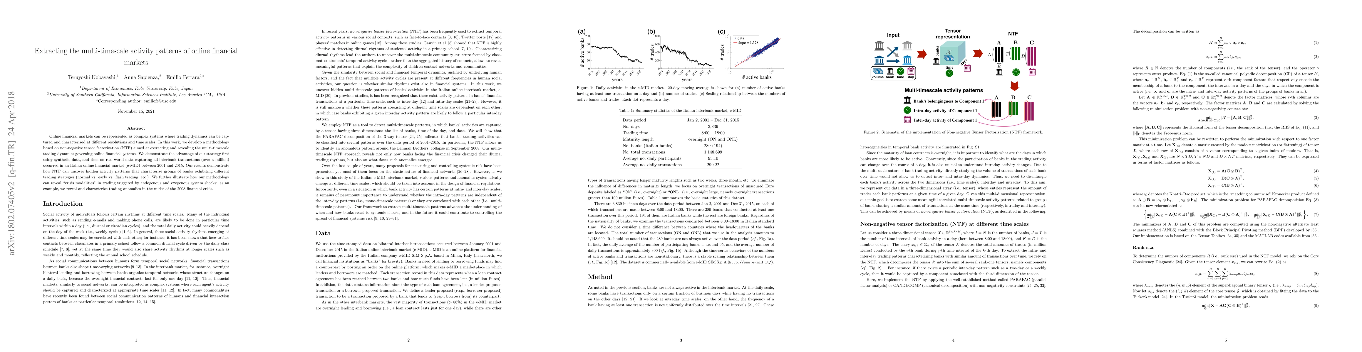 Online financial markets can be represented as complex systems where trading dynamics can be captured and characterized at different resolutions and time scales. In this work, we develop a methodology based on non-negative tensor factorization (NTF) aimed at extracting and revealing the multi-timescale trading dynamics governing online financial systems. We demonstrate the advantage of our strategy first using synthetic data, and then on real-world data capturing all interbank transactions (over a million) occurred in an Italian online financial market (e-MID) between 2001 and 2015. Our results demonstrate how NTF can uncover hidden activity patterns that characterize groups of banks exhibiting different trading strategies (normal vs. early vs. flash trading, etc.). We further illustrate how our methodology can reveal "crisis modalities" in trading triggered by endogenous and exogenous system shocks: as an example, we reveal and characterize trading anomalies in the midst of the 2008 financial crisis.