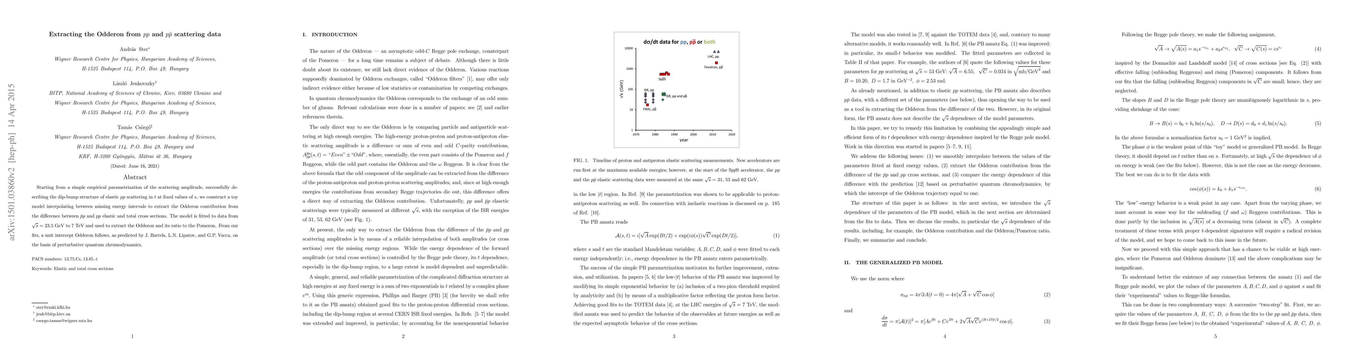 Starting from a simple empirical parametrization of the scattering amplitude, successfully describing the dip-bump structure of elastic $pp$ scattering in $t$ at fixed values of $s$, we construct a toy model interpolating between missing energy gaps to extract the Odderon contribution from the difference between $\bar pp$ and $pp$ elastic and total cross sections. The model is fitted to data from $\sqrt s=23.5$ GeV to 7 TeV and used to extract the Odderon and its ratio to the Pomeron.