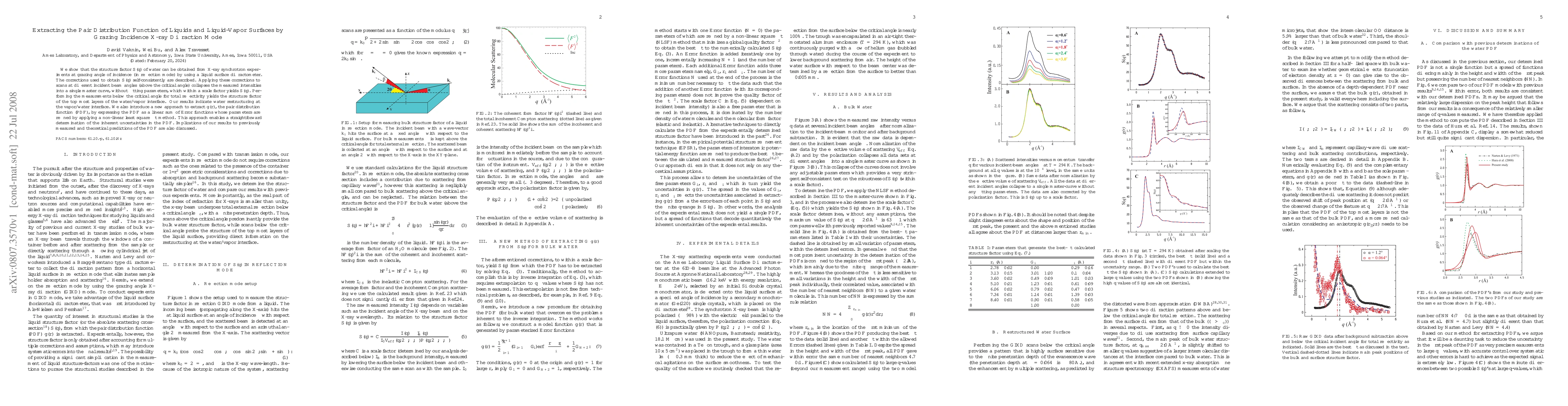 This paper demonstrates a method for obtaining the structure factor $S(q)$ of water via grazing incidence X-ray diffraction, revealing water restructuring at the vapor/water interface. A new approach to extract the pair distribution function $g(r)$ using Error functions and non-linear least squares fitting is introduced, providing a straightforward determination of inherent uncertainties.
