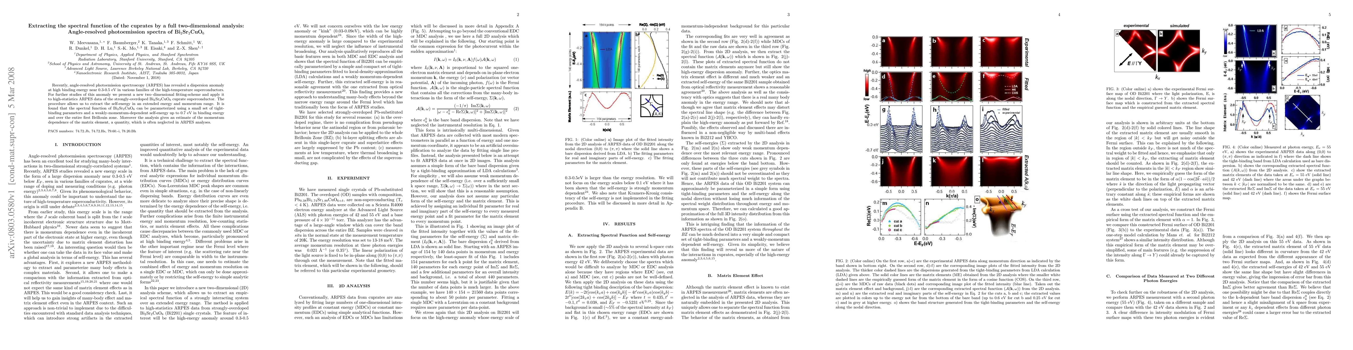 This paper introduces a new two-dimensional fitting method to analyze ARPES data from Bi2Sr2CuO6, revealing a dispersion anomaly near 0.3-0.5 eV. The method extracts the self-energy and shows that the spectral function can be parameterized with a small set of tight-binding parameters and a weakly-momentum-dependent self-energy up to 0.7 eV.