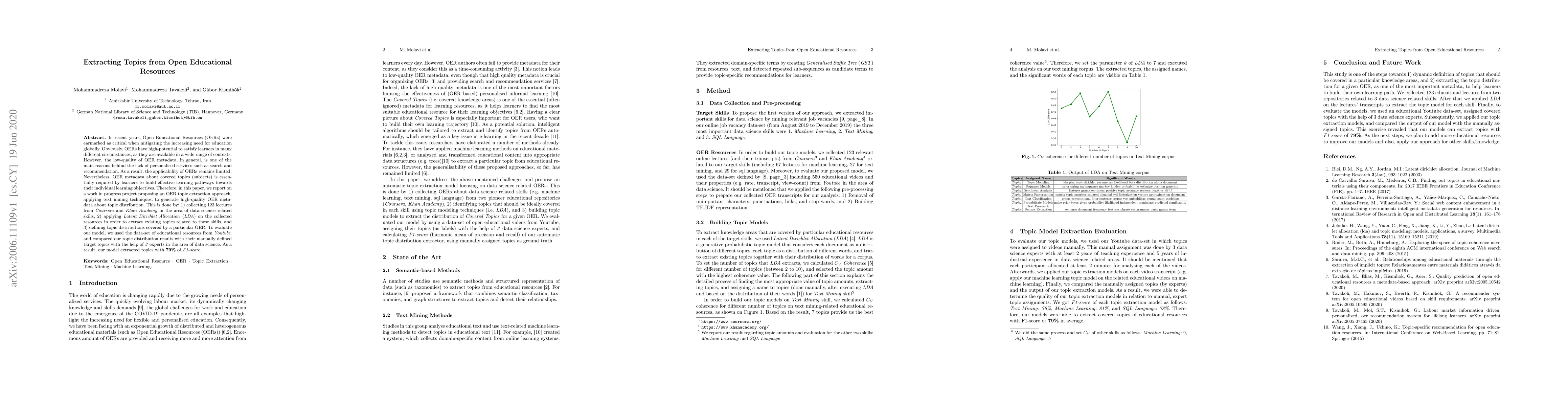 This paper proposes a text mining approach using Latent Dirichlet Allocation (LDA) to extract high-quality topics from Open Educational Resources (OERs) in data science. The method was tested on 123 lectures from Coursera and Khan Academy, showing a 79% F1-score in topic extraction accuracy when evaluated against manually defined topics by experts.