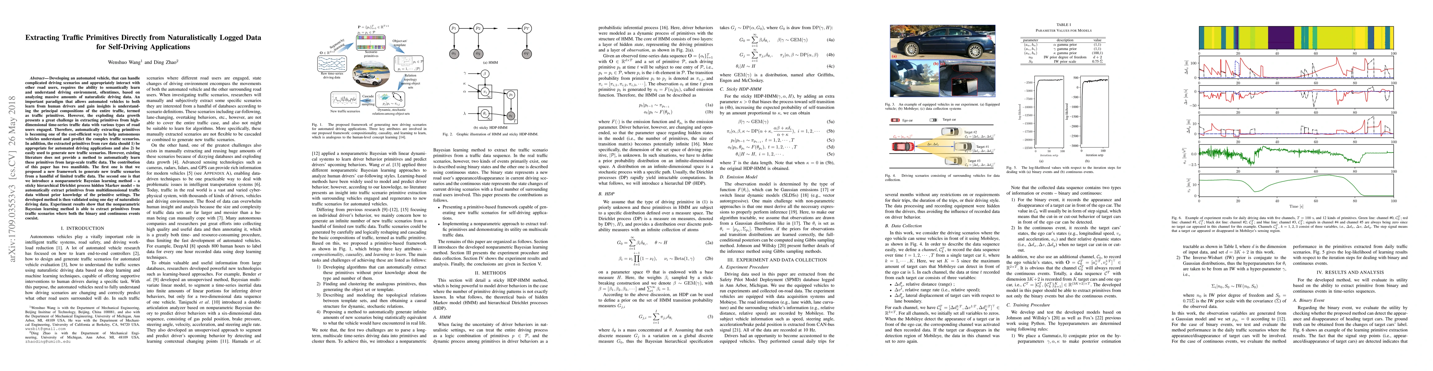 This paper proposes a new framework to automatically extract traffic primitives from large-scale naturalistic driving data, crucial for self-driving applications. It introduces a nonparametric Bayesian learning method, specifically a sticky hierarchical Dirichlet process hidden Markov model, to identify traffic primitives without predefined settings, validated with one day of naturalistic driving data.