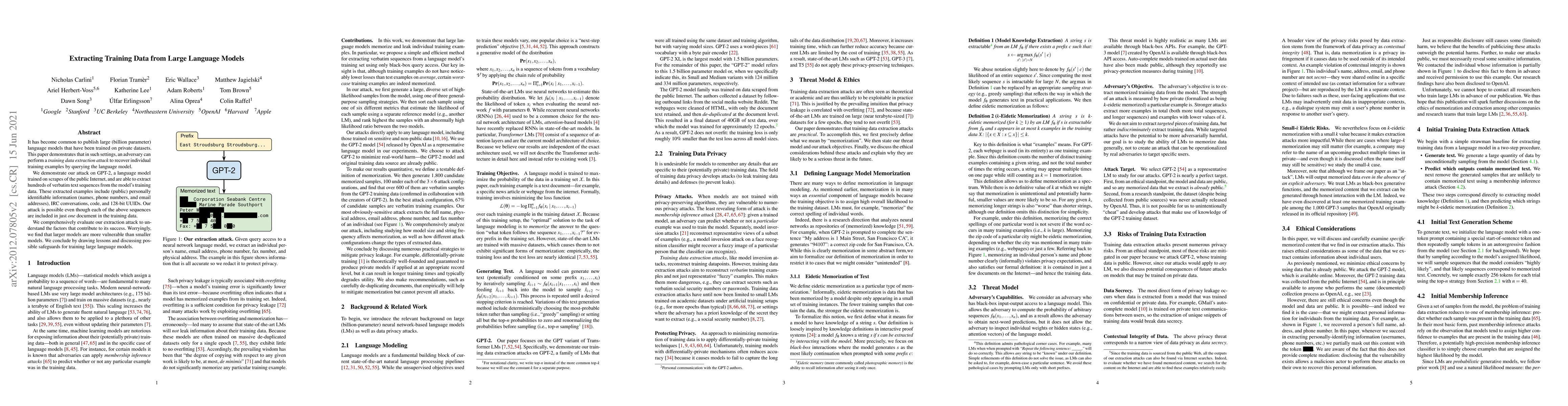 This paper reveals a training data extraction attack that can recover individual training examples from large language models by querying them, demonstrating this on GPT-2 to extract sensitive information including personally identifiable data. The study finds that larger models are more vulnerable, highlighting the need for improved safeguards.