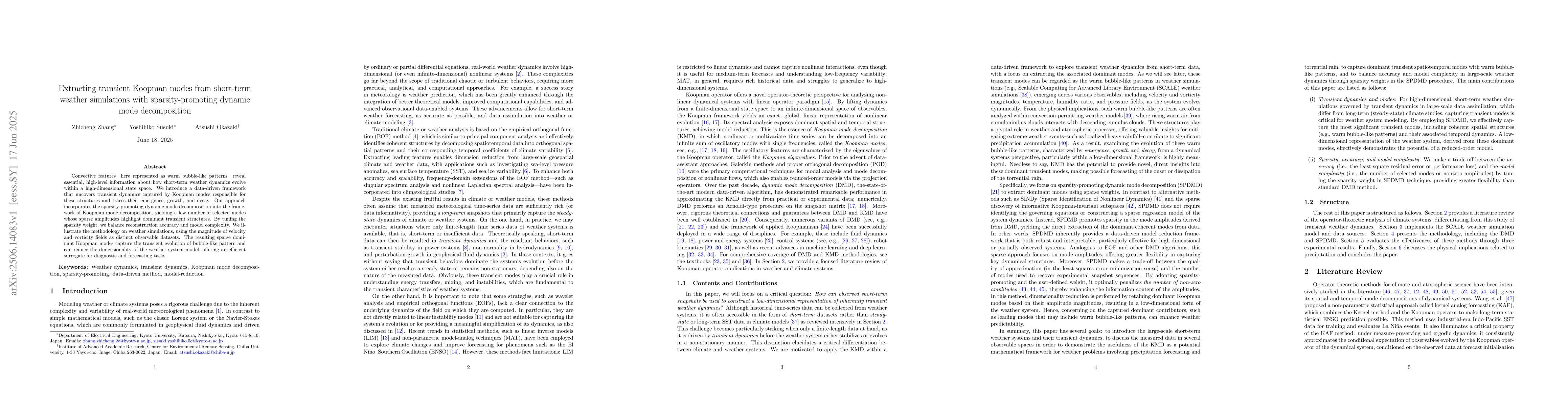Convective features-here represented as warm bubble-like patterns-reveal essential, high-level information about how short-term weather dynamics evolve within a high-dimensional state space. We introduce a data-driven framework that uncovers transient dynamics captured by Koopman modes responsible for these structures and traces their emergence, growth, and decay. Our approach incorporates the sparsity-promoting dynamic mode decomposition into the framework of Koopman mode decomposition, yielding a few number of selected modes whose sparse amplitudes highlight dominant transient structures. By tuning the sparsity weight, we balance reconstruction accuracy and model complexity. We illustrate the methodology on weather simulations, using the magnitude of velocity and vorticity fields as distinct observable datasets. The resulting sparse dominant Koopman modes capture the transient evolution of bubble-like pattern and can reduce the dimensionality of the weather system model, offering an efficient surrogate for diagnostic and forecasting tasks.