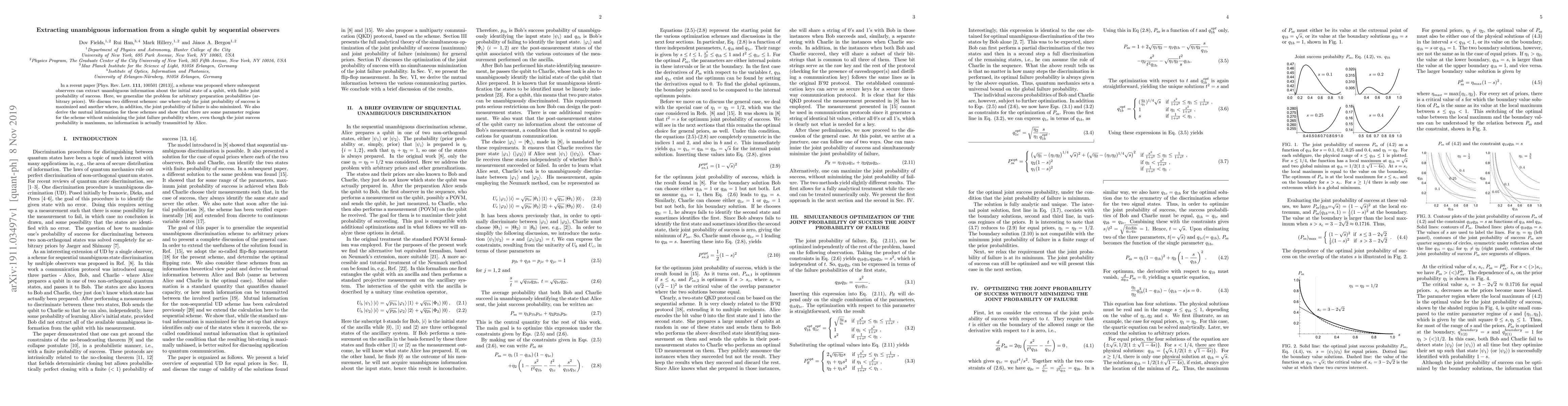 This paper generalizes a scheme for extracting unambiguous information from a single qubit by sequential observers under arbitrary preparation probabilities. It proposes two schemes: one maximizing joint success probability and another minimizing joint failure probability, and discusses the mutual information and information transmission.