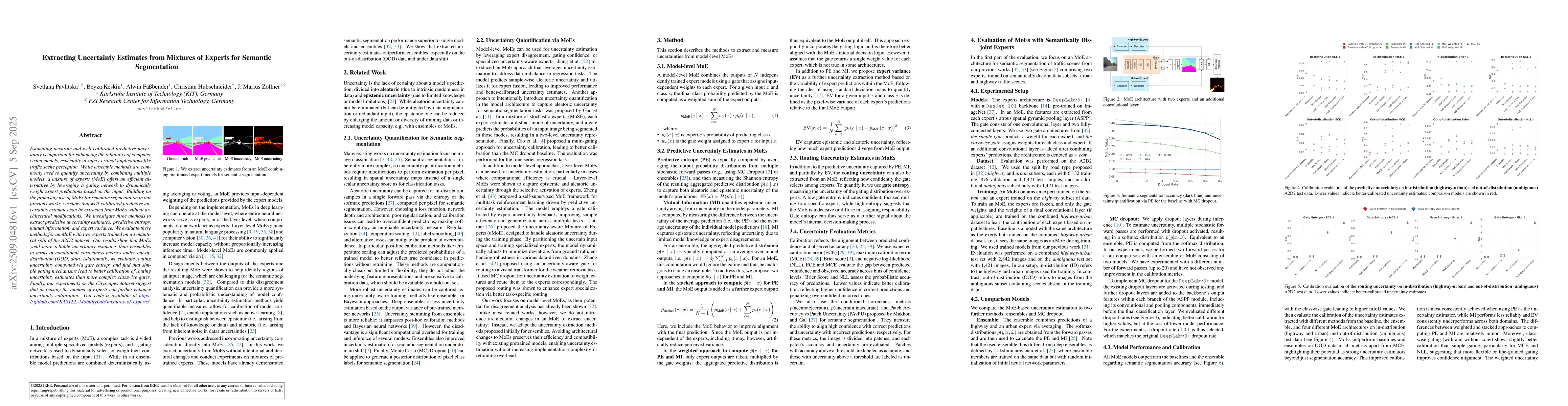 Estimating accurate and well-calibrated predictive uncertainty is important for enhancing the reliability of computer vision models, especially in safety-critical applications like traffic scene perception. While ensemble methods are commonly used to quantify uncertainty by combining multiple models, a mixture of experts (MoE) offers an efficient alternative by leveraging a gating network to dynamically weight expert predictions based on the input. Building on the promising use of MoEs for semantic segmentation in our previous works, we show that well-calibrated predictive uncertainty estimates can be extracted from MoEs without architectural modifications. We investigate three methods to extract predictive uncertainty estimates: predictive entropy, mutual information, and expert variance. We evaluate these methods for an MoE with two experts trained on a semantical split of the A2D2 dataset. Our results show that MoEs yield more reliable uncertainty estimates than ensembles in terms of conditional correctness metrics under out-of-distribution (OOD) data. Additionally, we evaluate routing uncertainty computed via gate entropy and find that simple gating mechanisms lead to better calibration of routing uncertainty estimates than more complex classwise gates. Finally, our experiments on the Cityscapes dataset suggest that increasing the number of experts can further enhance uncertainty calibration. Our code is available at https://github.com/KASTEL-MobilityLab/mixtures-of-experts/.