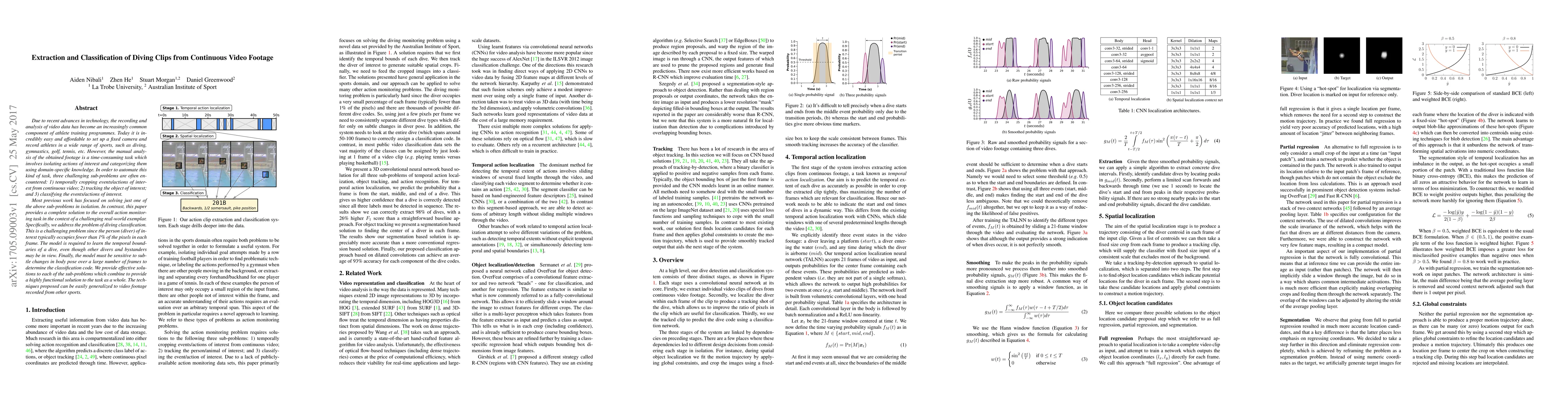 Due to recent advances in technology, the recording and analysis of video data has become an increasingly common component of athlete training programmes. Today it is incredibly easy and affordable to set up a fixed camera and record athletes in a wide range of sports, such as diving, gymnastics, golf, tennis, etc. However, the manual analysis of the obtained footage is a time-consuming task which involves isolating actions of interest and categorizing them using domain-specific knowledge. In order to automate this kind of task, three challenging sub-problems are often encountered: 1) temporally cropping events/actions of interest from continuous video; 2) tracking the object of interest; and 3) classifying the events/actions of interest. Most previous work has focused on solving just one of the above sub-problems in isolation. In contrast, this paper provides a complete solution to the overall action monitoring task in the context of a challenging real-world exemplar. Specifically, we address the problem of diving classification. This is a challenging problem since the person (diver) of interest typically occupies fewer than 1% of the pixels in each frame. The model is required to learn the temporal boundaries of a dive, even though other divers and bystanders may be in view. Finally, the model must be sensitive to subtle changes in body pose over a large number of frames to determine the classification code. We provide effective solutions to each of the sub-problems which combine to provide a highly functional solution to the task as a whole. The techniques proposed can be easily generalized to video footage recorded from other sports.