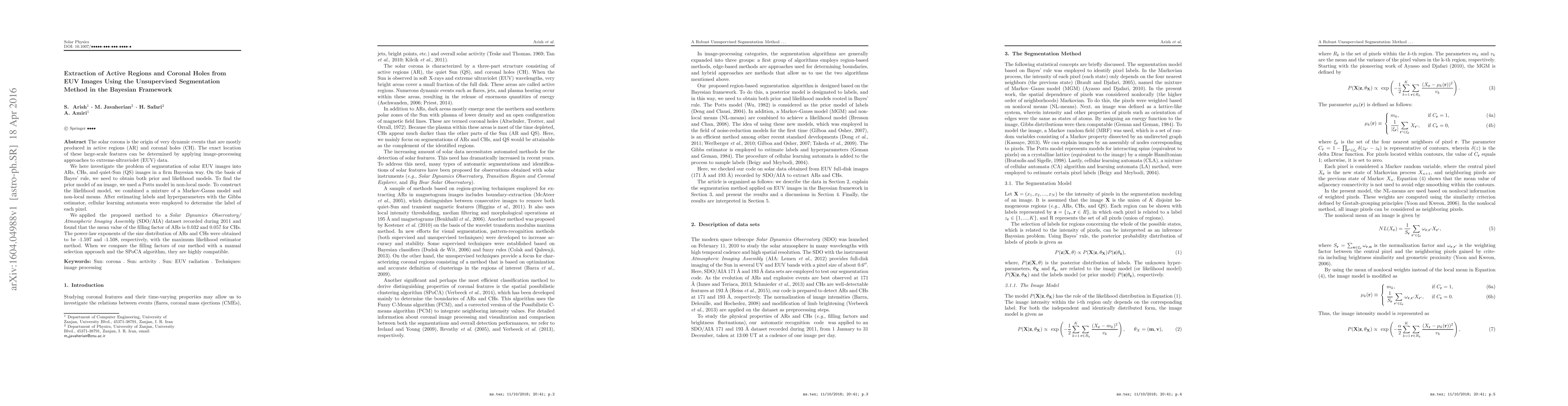 The solar corona is the origin of very dynamic events that are mostly produced in active regions (AR) and coronal holes (CH). The exact location of these large-scale features can be determined by applying image-processing approaches to extreme-ultraviolet (EUV) data. We here investigate the problem of segmentation of solar EUV images into ARs, CHs, and quiet-Sun (QS) images in a firm Bayesian way. On the basis of Bayes' rule, we need to obtain both prior and likelihood models. To find the prior model of an image, we used a Potts model in non-local mode. To construct the likelihood model, we combined a mixture of a Markov-Gauss model and non-local means. After estimating labels and hyperparameters with the Gibbs estimator, cellular learning automata were employed to determine the label of each pixel. We applied the proposed method to a Solar Dynamics Observatory/ Atmospheric Imaging Assembly (SDO/AIA) dataset recorded during 2011 and found that the mean value of the filling factor of ARs is 0.032 and 0.057 for CHs. The power-law exponents of the size distribution of ARs and CHs were obtained to be -1.597 and -1.508, respectively, with the maximum likelihood estimator method. When we compare the filling factors of our method with a manual selection approach and the SPoCA algorithm, they are highly compatible.