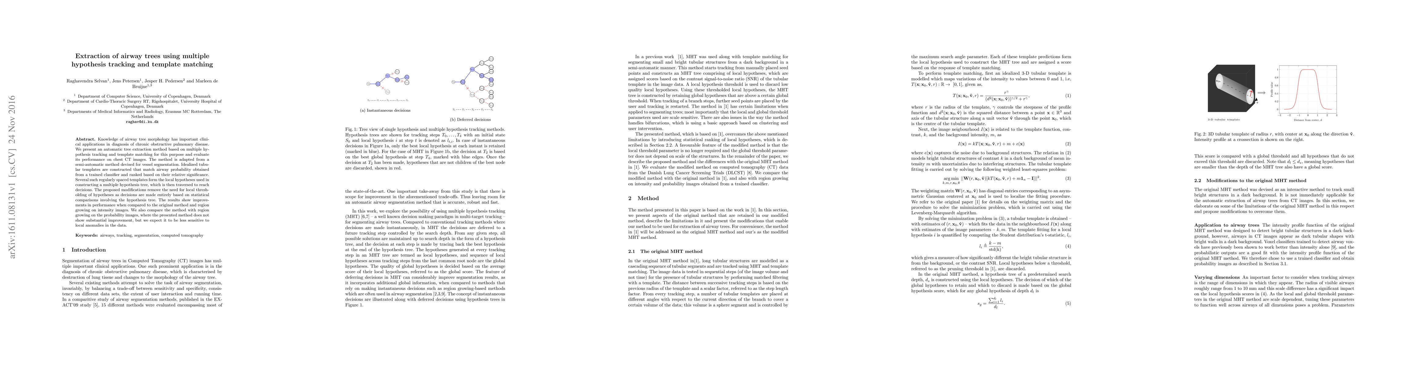 Knowledge of airway tree morphology has important clinical applications in diagnosis of chronic obstructive pulmonary disease. We present an automatic tree extraction method based on multiple hypothesis tracking and template matching for this purpose and evaluate its performance on chest CT images. The method is adapted from a semi-automatic method devised for vessel segmentation. Idealized tubular templates are constructed that match airway probability obtained from a trained classifier and ranked based on their relative significance. Several such regularly spaced templates form the local hypotheses used in constructing a multiple hypothesis tree, which is then traversed to reach decisions. The proposed modifications remove the need for local thresholding of hypotheses as decisions are made entirely based on statistical comparisons involving the hypothesis tree. The results show improvements in performance when compared to the original method and region growing on intensity images. We also compare the method with region growing on the probability images, where the presented method does not show substantial improvement, but we expect it to be less sensitive to local anomalies in the data.
