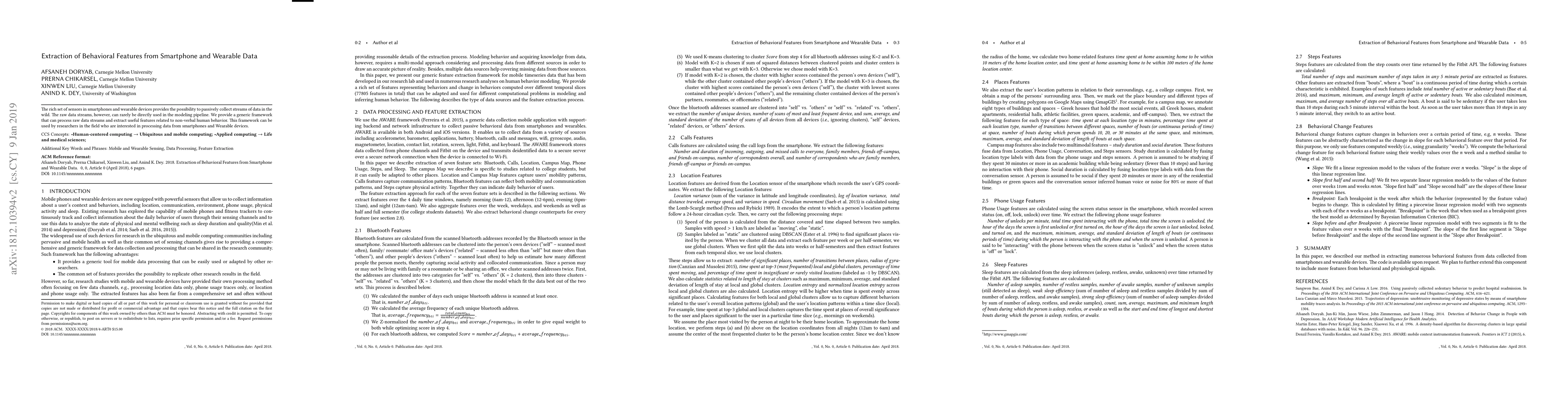 This paper presents a framework for extracting behavioral features from raw data streams collected by smartphones and wearable devices, enabling researchers to analyze non-verbal human behavior. The framework aims to facilitate the processing of sensor data for behavioral modeling.