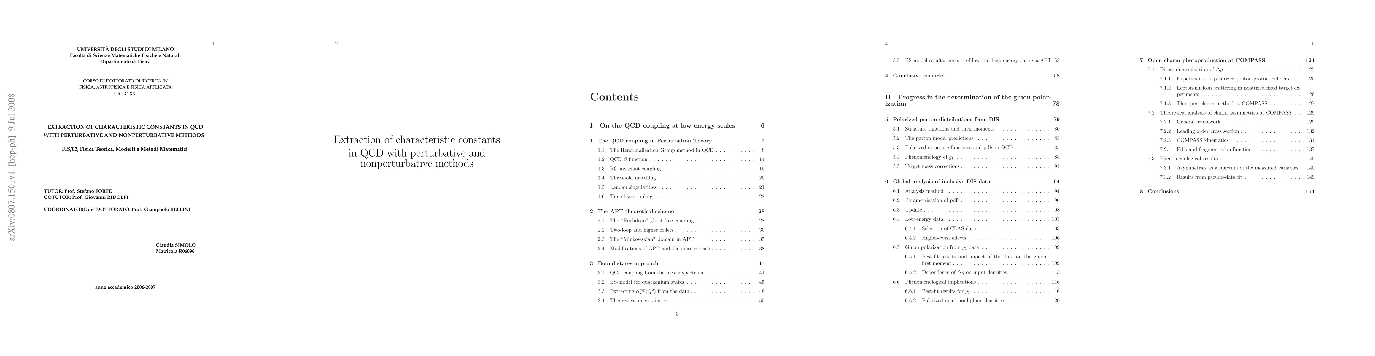 Part I is devoted to the extraction of the QCD coupling from a bound state approach at low energy scales, where unphysical singularities make the RG-improved pQCD useless. Theoretical results on the meson spectrum based on a Bethe-Salpeter formalism adjusted for QCD have been exploited for the determination of experimental values of \alpha_s below 1GeV by comparison with the data. Results quantitatively confirm the recently developed Analytic Perturbation Theory approach to IR phenomena down to 200 MeV. Below this scale the extracted values give a hint about the vanishing of the QCD coupling as Q^2 goes to zero. In part II the possibility of inferring the spin-dependent gluon distribution from scaling violations is addressed by performing a NLO analysis of inclusive DIS data in pQCD. In addition, this work presents a phenomenological study of open-charm photoproduction in the polarized case, which is tailored to the COMPASS experiment in view of upcoming data. It is shown that current inclusive data allow a reliable determination of the gluon first moment, whereas the x-shape is significantly affected by the assumed functional form. On the other hand, studies of charm pseudo-data reveal that the open-charm approach should be capable to reduce the bias induced by the choice of input densities, and to pin down the x-shape of the gluon polarization.