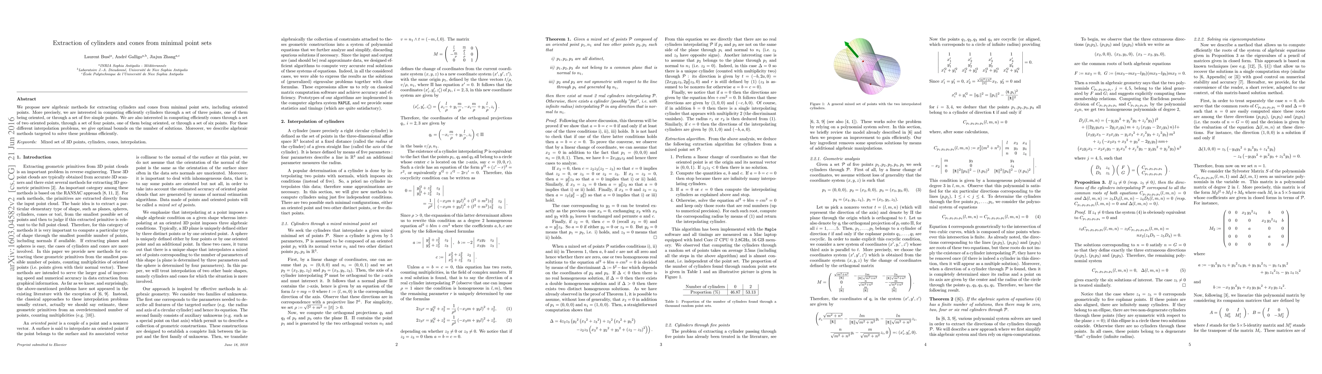 This paper introduces new algebraic techniques for efficiently extracting cylinders and cones from minimal point sets, including oriented points. It provides optimal bounds on the number of solutions for various interpolation problems and describes efficient algebraic methods to solve them.