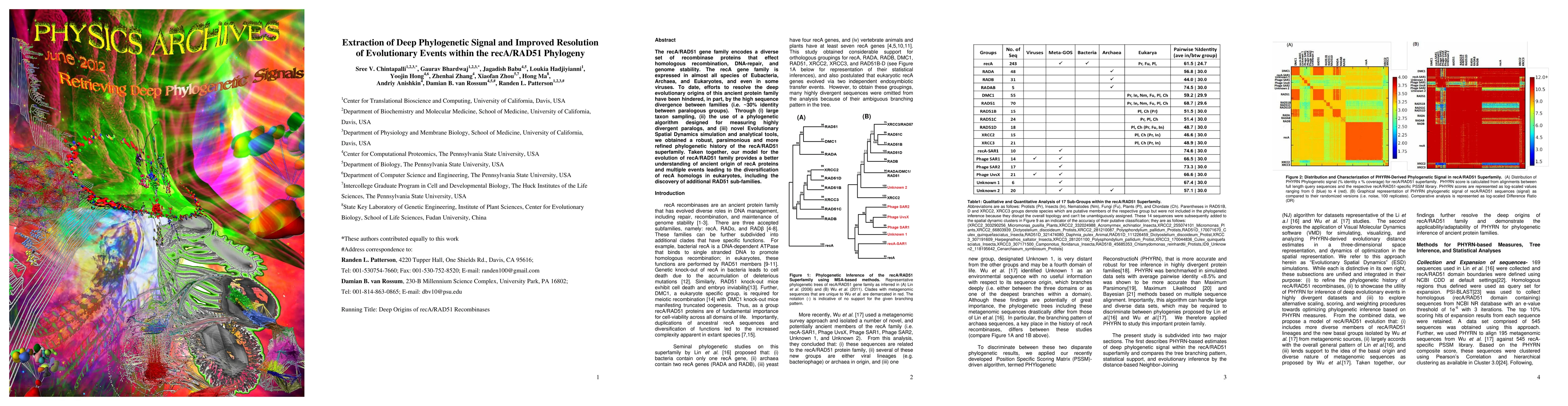 The recA/RAD51 gene family encodes a diverse set of recombinase proteins that effect homologous recombination, DNA-repair, and genome stability. The recA gene family is expressed in almost all species of Eubacteria, Archaea, and Eukaryotes, and even in some viruses. To date, efforts to resolve the deep evolutionary origins of this ancient protein family have been hindered, in part, by the high sequence divergence between families (i.e. ~30% identity between paralogous groups). Through (i) large taxon sampling, (ii) the use of a phylogenetic algorithm designed for measuring highly divergent paralogs, and (iii) novel Evolutionary Spatial Dynamics simulation and analytical tools, we obtained a robust, parsimonious and more refined phylogenetic history of the recA/RAD51 superfamily. Taken together, our model for the evolution of recA/RAD51 family provides a better understanding of ancient origin of recA proteins and multiple events leading to the diversification of recA homologs in eukaryotes, including the discovery of additional RAD51 sub-families.