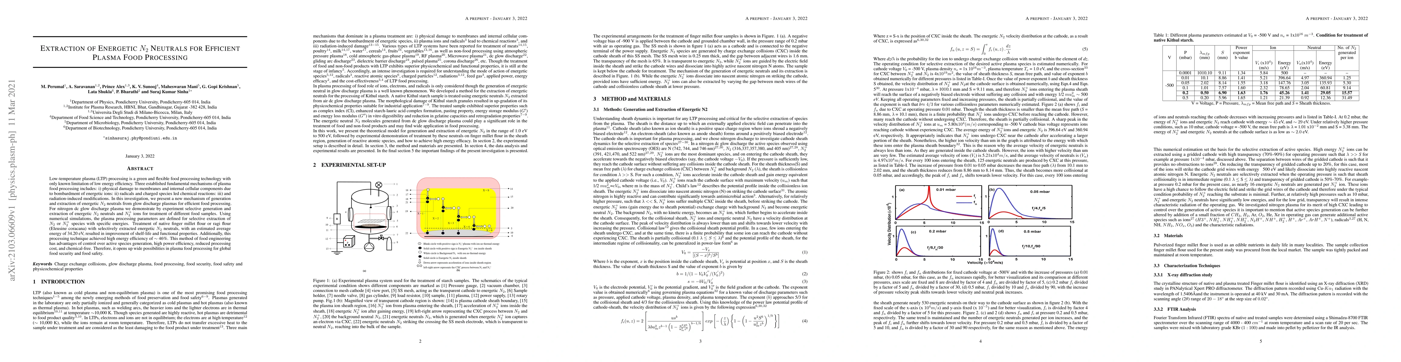 Low-temperature plasma (LTP) processing is a green and flexible food processing technology with only known limitation of low energy efficiency. Three established fundamental mechanisms of plasma food processing includes: i) physical damage to membranes and internal cellular components due to bombardment of energetic ions: ii) radicals and charged species led chemical reactions: iii) and radiation-induced modifications. In this investigation, we present a new mechanism of generation and extraction of energetic $N_2$ neutrals from glow discharge plasmas for efficient food processing. For nitrogen dc glow discharge plasma we demonstrate by experiment selective generation and extraction of energetic $N_2$ neutrals and $N_2^+$ ions for treatment of different food samples. Using numerical simulations, the plasma processing parameters are defined for selective extraction of $N_2$ or $N_2^+$ species with specific energies. Treatment of native finger millet flour or ragi flour (Eleusine coracana) with selectively extracted energetic $N_2$ neutrals, with an estimated average energy of 34.20 eV, resulted in improvement of shelf-life and functional properties. Additionally, this processing technique achieved high energy efficiency of ~ 46%. This method of food engineering has advantages of control over active species generation, high power efficiency, reduced processing cost, and chemical-free. Therefore, it opens up wide possibilities in plasma food processing for global food security and food safety.