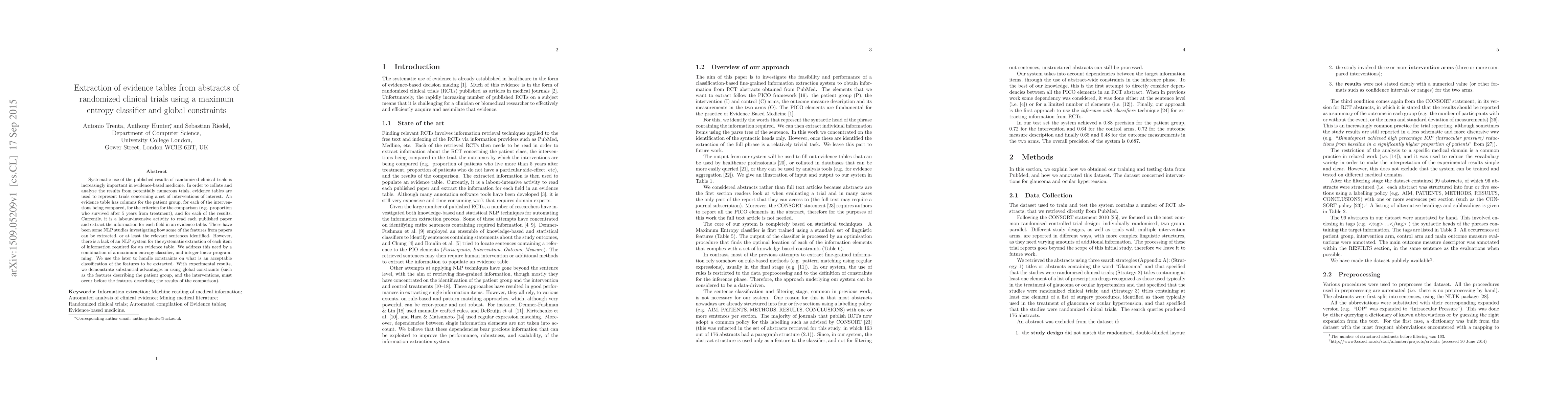 Systematic use of the published results of randomized clinical trials is increasingly important in evidence-based medicine. In order to collate and analyze the results from potentially numerous trials, evidence tables are used to represent trials concerning a set of interventions of interest. An evidence table has columns for the patient group, for each of the interventions being compared, for the criterion for the comparison (e.g. proportion who survived after 5 years from treatment), and for each of the results. Currently, it is a labour-intensive activity to read each published paper and extract the information for each field in an evidence table. There have been some NLP studies investigating how some of the features from papers can be extracted, or at least the relevant sentences identified. However, there is a lack of an NLP system for the systematic extraction of each item of information required for an evidence table. We address this need by a combination of a maximum entropy classifier, and integer linear programming. We use the later to handle constraints on what is an acceptable classification of the features to be extracted. With experimental results, we demonstrate substantial advantages in using global constraints (such as the features describing the patient group, and the interventions, must occur before the features describing the results of the comparison).