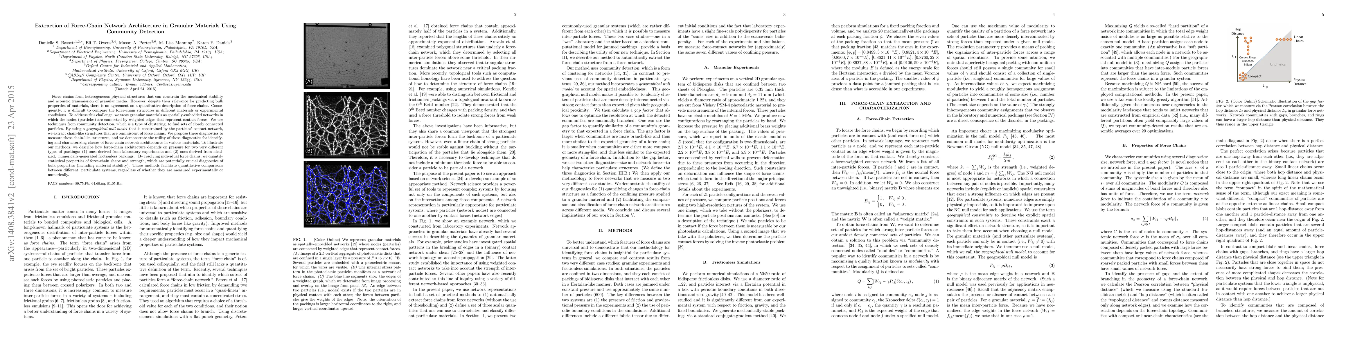 The research treats granular materials as spatially-embedded networks, connecting nodes (particles) with weighted edges representing contact forces. Community detection techniques, specifically modularity maximization with a geographical null model, are employed to identify tightly connected 'communities' reminiscent of force chains in both numerical and laboratory packings.