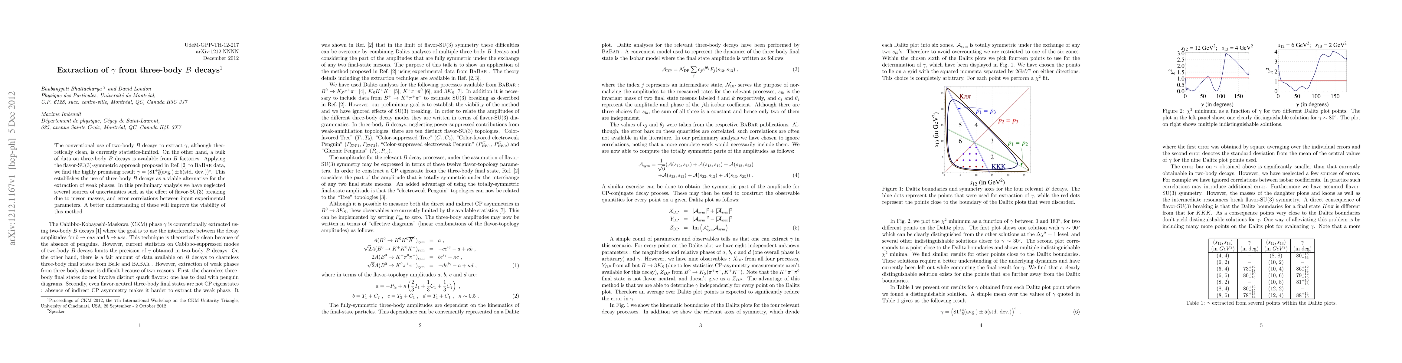 Researchers successfully extracted the weak phase gamma using three-body B decays for the first time, achieving a promising result with an average value of 81 degrees and a standard deviation of 5 degrees.