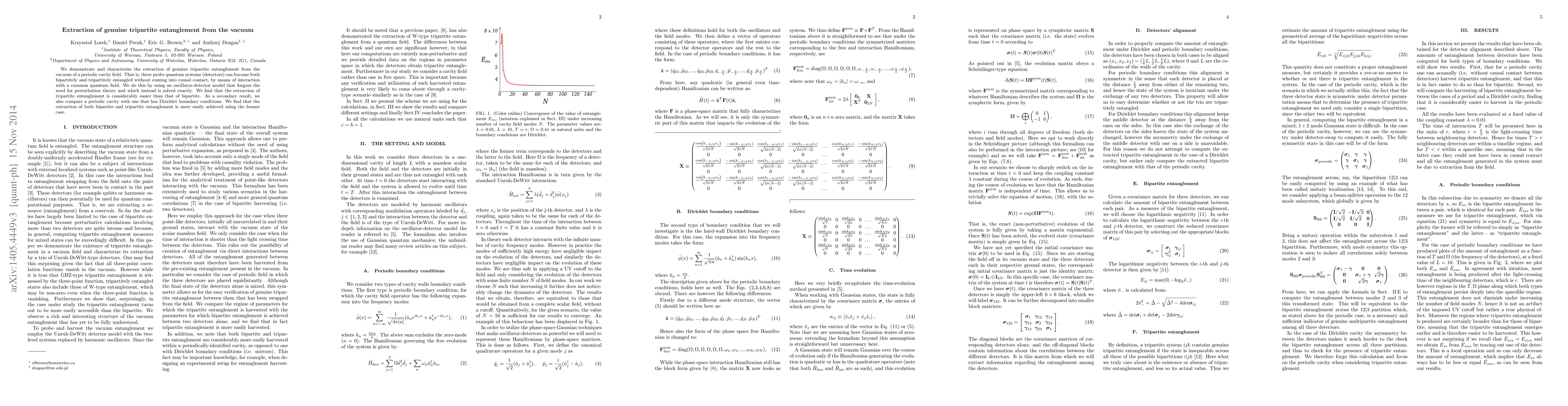 We demonstrate and characterize the extraction of genuine tripartite entanglement from the vacuum of a periodic cavity field. That is, three probe quantum systems (detectors) can become both bipartitely and tripartitely entangled without coming into causal contact, by means of interaction with a common quantum field. We do this by using an oscillator-detector model that forgoes the need for perturbation theory and which instead is solved exactly. We find that the extraction of tripartite entanglement is considerably easier than that of bipartite. As a secondary result, we also compare a periodic cavity with one that has Dirichlet boundary conditions. We find that the extraction of both bipartite and tripartite entanglement is more easily achieved using the former case.