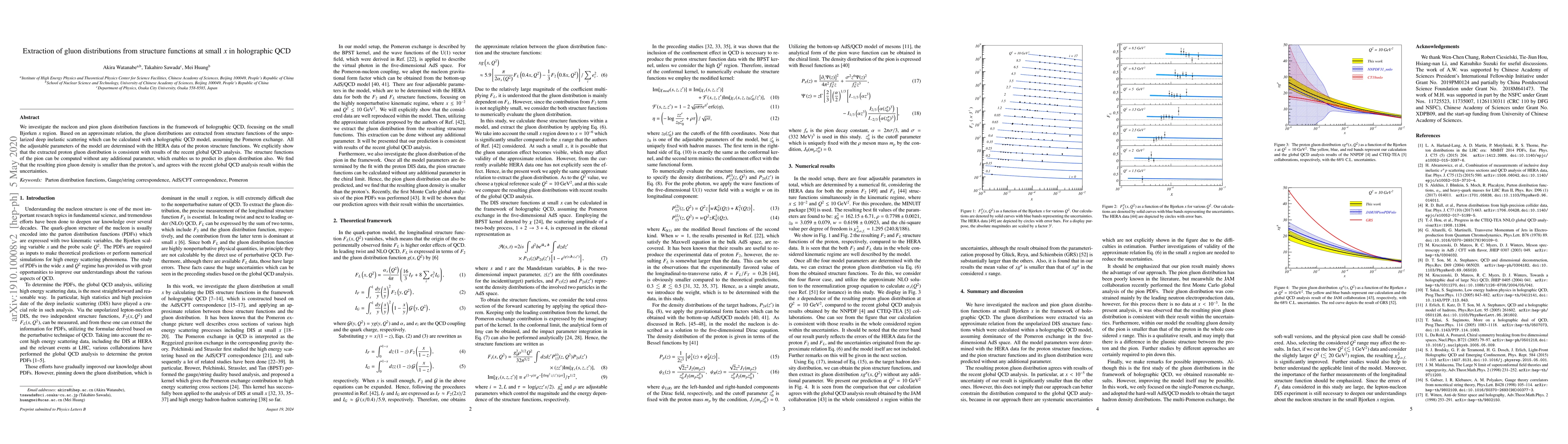 This paper explores nucleon and pion gluon distribution functions using holographic QCD at small Bjorken x, extracting them from deep inelastic scattering structure functions. The model's parameters are fitted to HERA data, showing consistency with global QCD analysis results for both proton and pion gluon distributions.
