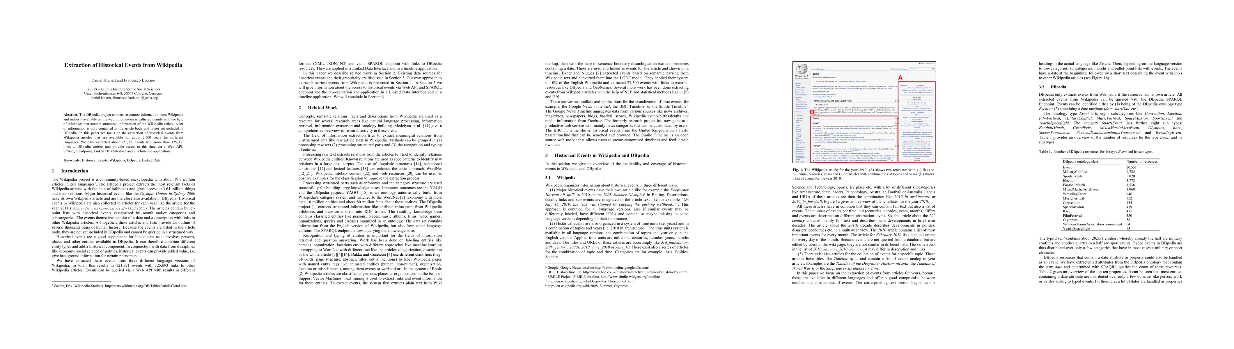This paper details the extraction of historical events from Wikipedia, focusing on articles spanning 2,500 years. The authors extracted about 121,000 events, linking them to over 325,000 DBpedia entities, and made the data accessible via various interfaces including a Web API and a timeline application.