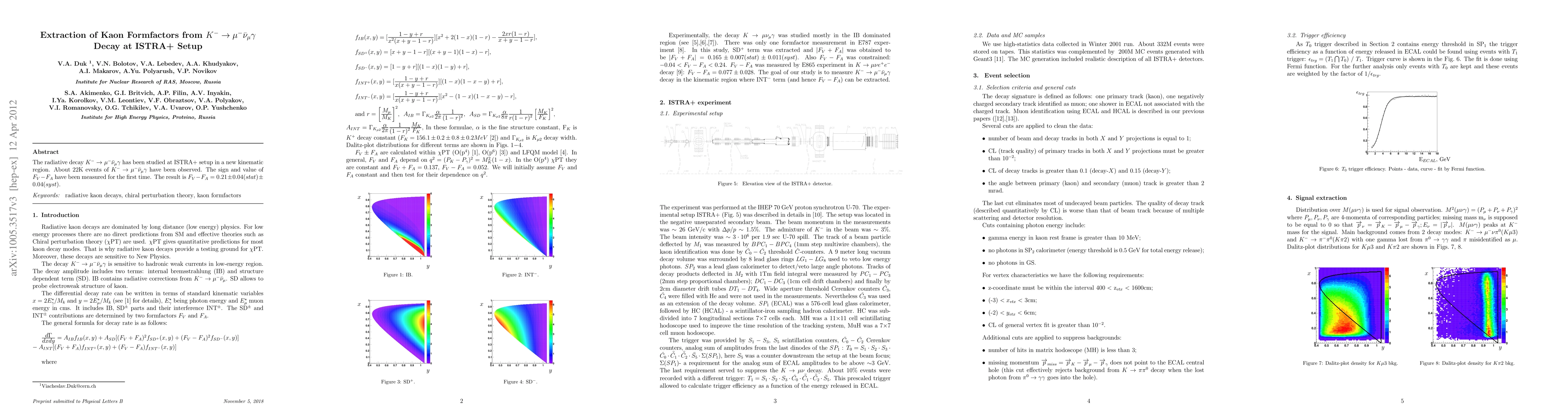 Summary: The ISTRA+ setup observed approximately 22,000 events of the decay K^- -> mu^- nu_mu gamma, measuring the formfactor difference Fv-Fa for the first time as 0.21(4)(4), providing new insights into kaon decay processes.