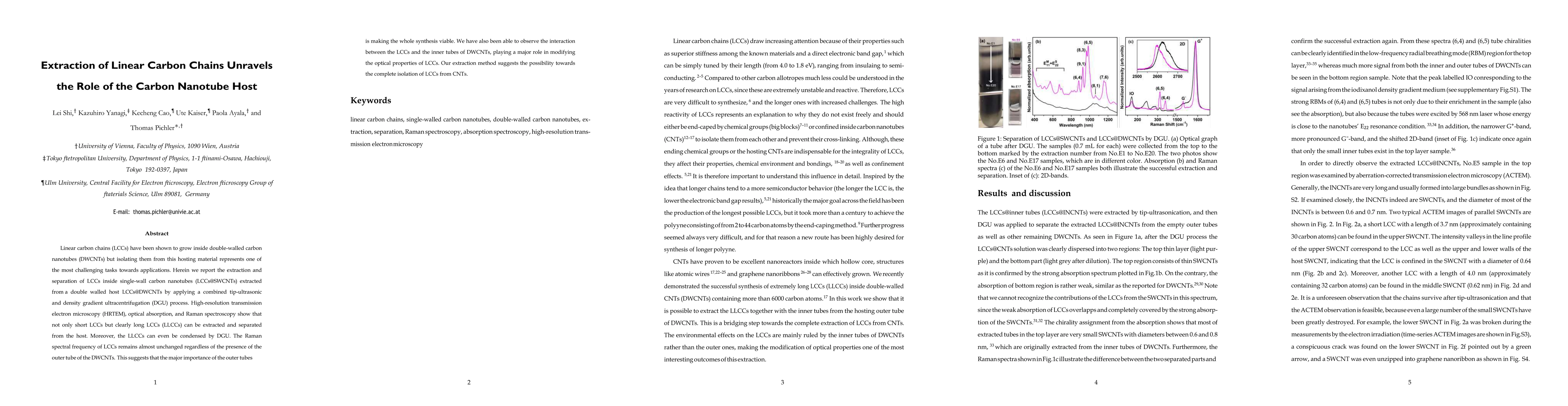 This research details a method for extracting long linear carbon chains (LCCs) from double-walled carbon nanotubes (DWCNTs) using a combined tip-ultrasonic and density gradient ultracentrifugation process. The extracted LCCs maintain their properties, indicating the outer DWCNT tube's primary role is facilitating synthesis. The study also reveals the inner tube's influence on LCC optical properties, suggesting potential for complete LCC isolation from CNTs.