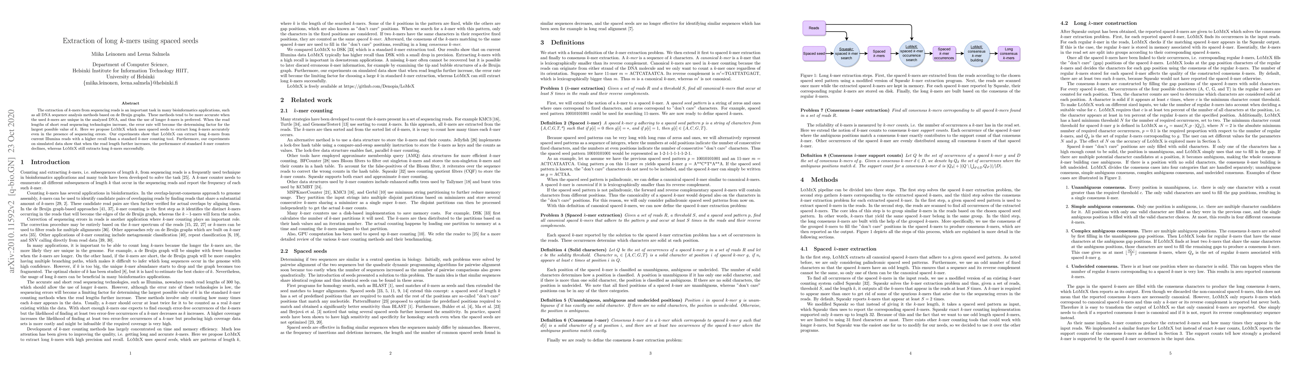 The research proposes LoMeX, a tool for extracting long k-mers from sequencing data using spaced seeds, which can accurately find long k-mers even with sequencing errors.