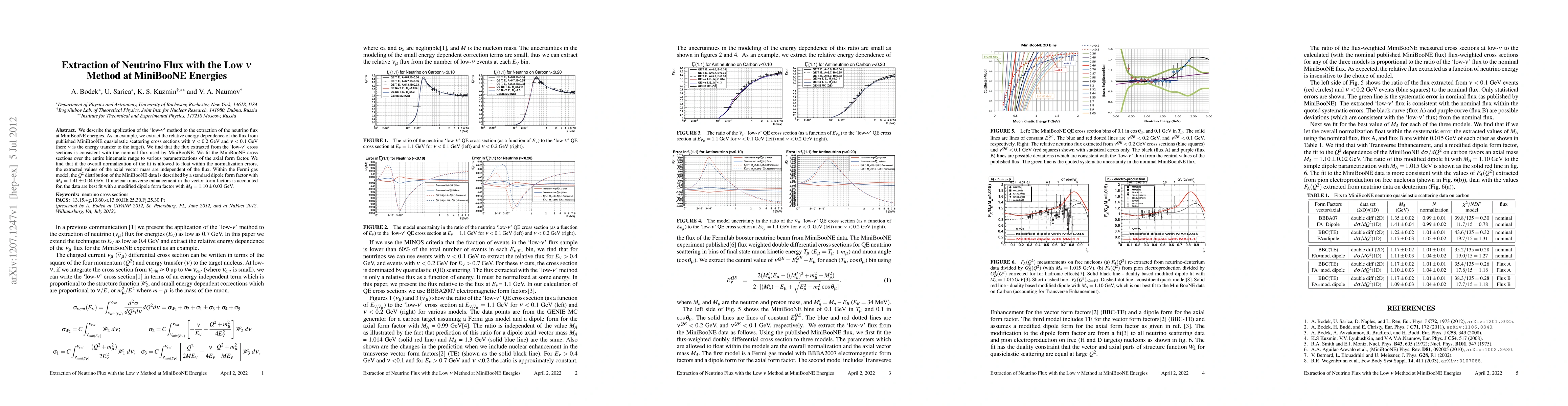 This paper applies the `low-$\nu$' method to extract the neutrino flux at MiniBooNE energies, finding consistency with the nominal flux. It also fits the MiniBooNE cross sections to various axial form factors, concluding that the extracted axial vector mass values are flux-independent.