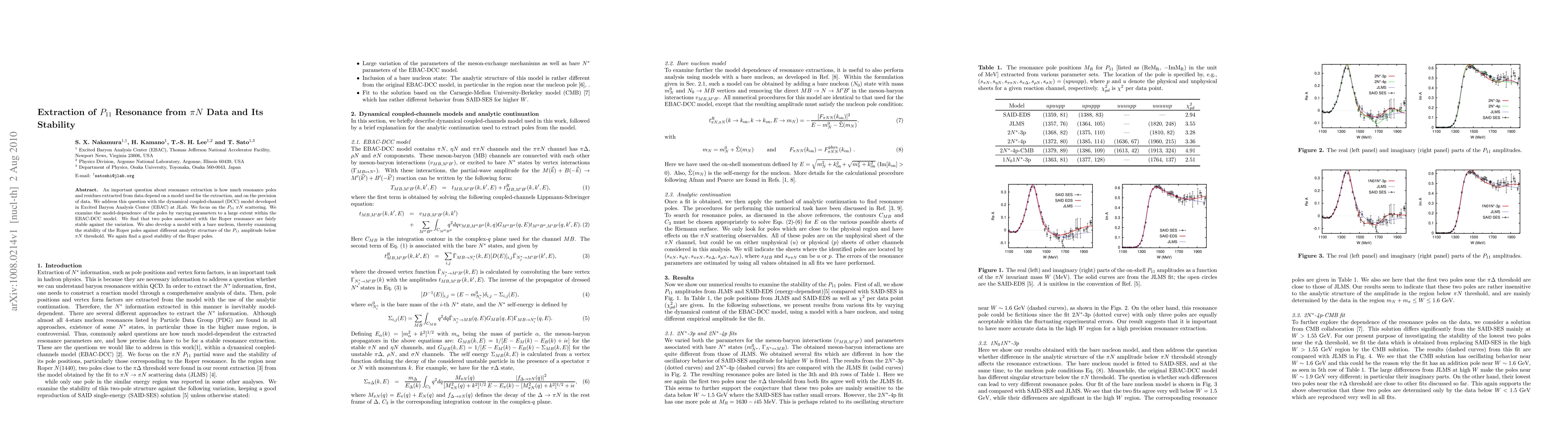 An important question about resonance extraction is how much resonance poles and residues extracted from data depend on a model used for the extraction, and on the precision of data. We address this question with the dynamical coupled-channel (DCC) model developed in Excited Baryon Analysis Center (EBAC) at JLab. We focus on the P11 pi-N scattering. We examine the model-dependence of the poles by varying parameters to a large extent within the EBAC-DCC model. We find that two poles associated with the Roper resonance are fairly stable against the variation. We also develop a model with a bare nucleon, thereby examining the stability of the Roper poles against different analytic structure of the P11 amplitude below pi-N threshold. We again find a good stability of the Roper poles.