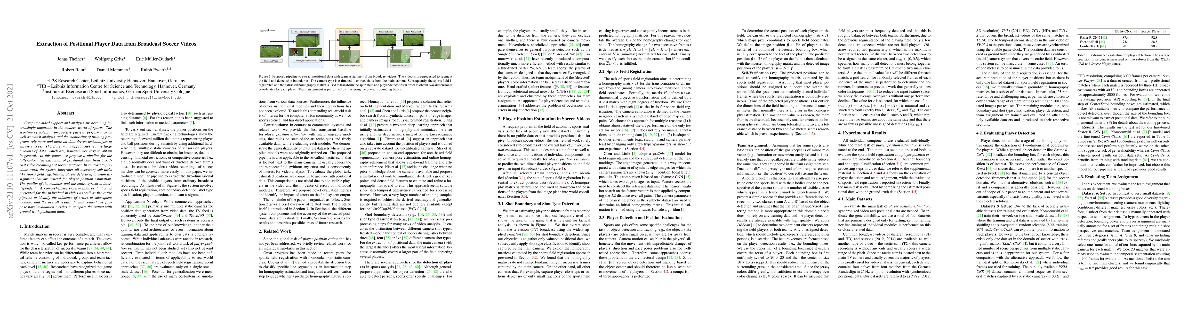 Computer-aided support and analysis are becoming increasingly important in the modern world of sports. The scouting of potential prospective players, performance as well as match analysis, and the monitoring of training programs rely more and more on data-driven technologies to ensure success. Therefore, many approaches require large amounts of data, which are, however, not easy to obtain in general. In this paper, we propose a pipeline for the fully-automated extraction of positional data from broadcast video recordings of soccer matches. In contrast to previous work, the system integrates all necessary sub-tasks like sports field registration, player detection, or team assignment that are crucial for player position estimation. The quality of the modules and the entire system is interdependent. A comprehensive experimental evaluation is presented for the individual modules as well as the entire pipeline to identify the influence of errors to subsequent modules and the overall result. In this context, we propose novel evaluation metrics to compare the output with ground-truth positional data.