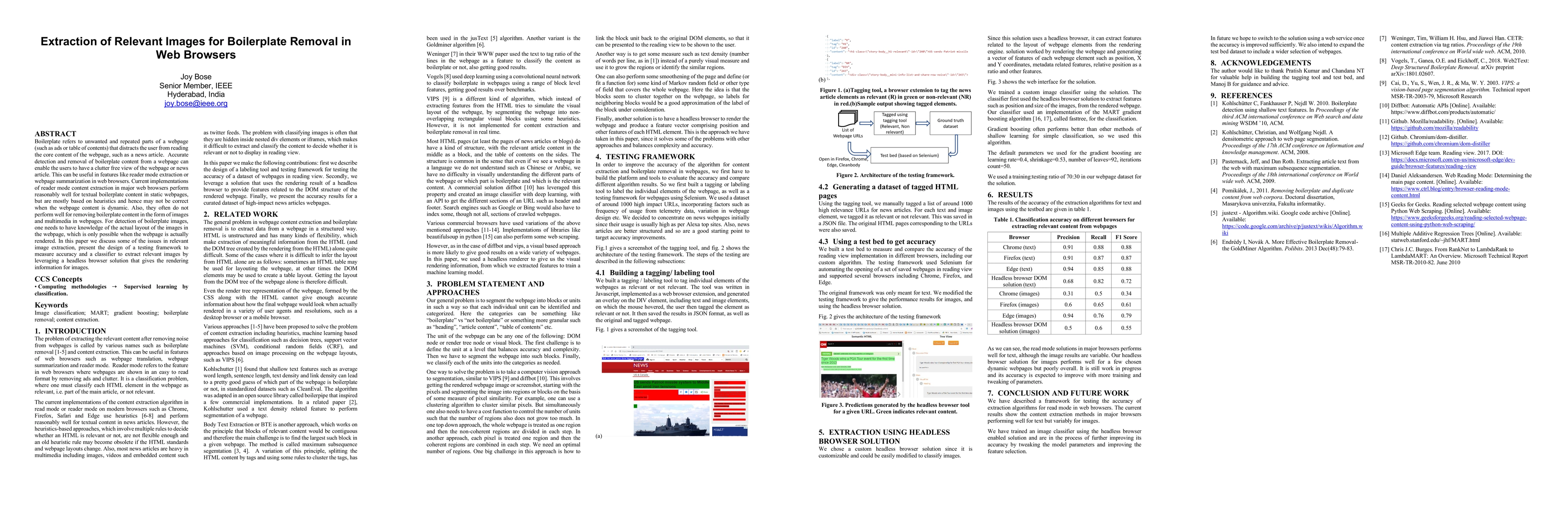 Boilerplate refers to unwanted and repeated parts of a webpage (such as ads or table of contents) that distracts the user from reading the core content of the webpage, such as a news article. Accurate detection and removal of boilerplate content from a webpage can enable the users to have a clutter free view of the webpage or news article. This can be useful in features like reader mode in web browsers. Current implementations of reader mode in web browsers such as Firefox, Chrome and Edge perform reasonably well for textual content in webpages. However, they are mostly heuristic based and not flexible when the webpage content is dynamic. Also they often do not perform well for removing boilerplate content in the form of images and multimedia in webpages. For detection of boilerplate images, one needs to have knowledge of the actual layout of the images in the webpage, which is only possible when the webpage is rendered. In this paper we discuss some of the issues in relevant image extraction. We also present the design of a testing framework to measure accuracy and a classifier to extract relevant images by leveraging a headless browser solution that gives the rendering information for images.