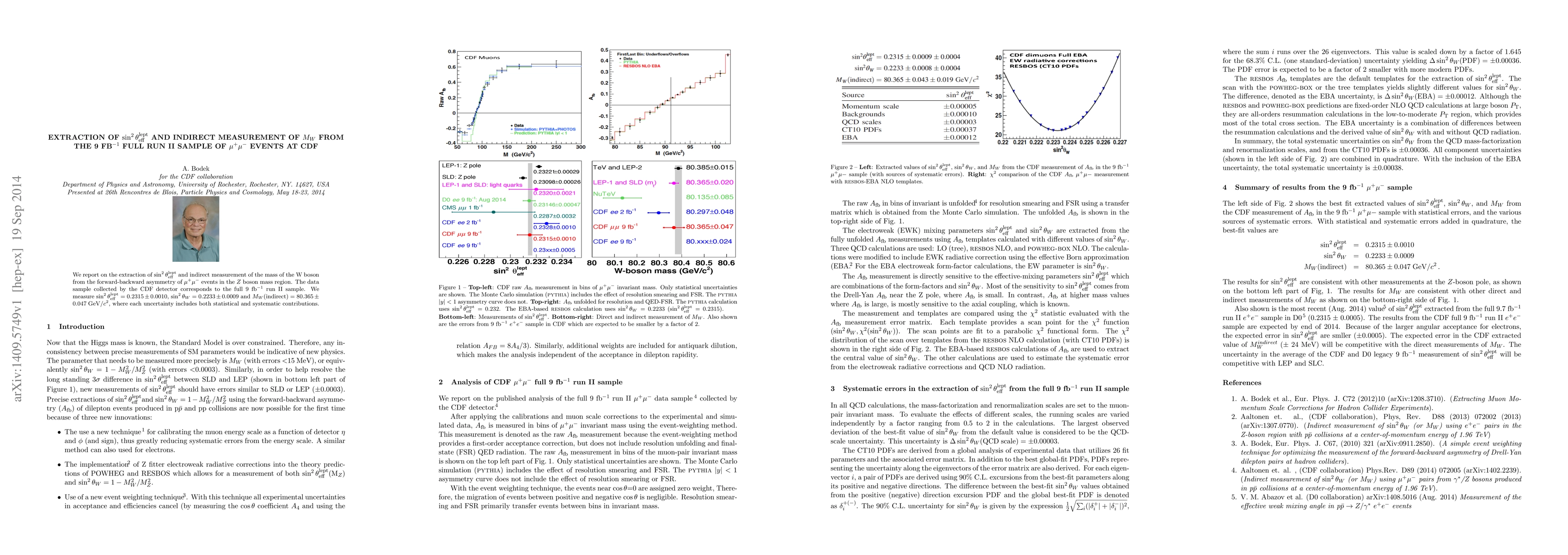 Researchers at CDF extracted $rac{ ext{sin}^2 heta^ ext{lept}_{ ext{eff}}}{ ext{cos}^2 heta_W}$ from $Z$ boson mass region data to indirectly measure the W boson's mass, with results: $rac{ ext{sin}^2 heta^ ext{lept}_{ ext{eff}}}{ ext{cos}^2 heta_W} = 0.2315 ext{ and } M_W = 80.365$ GeV/c$^2$.