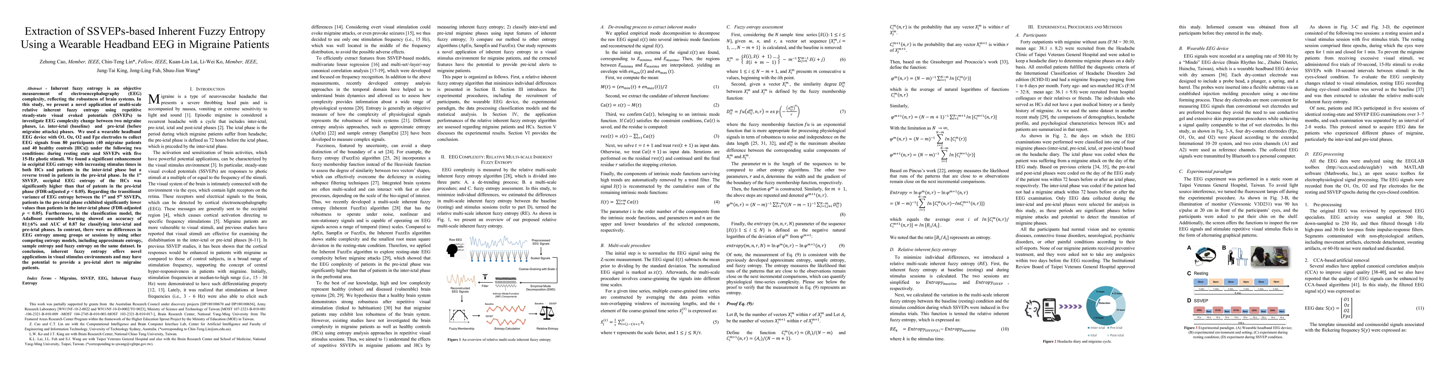 This study investigates EEG complexity changes in migraine patients using inherent fuzzy entropy and SSVEPs, revealing significant differences in occipital EEG entropy between inter-ictal and pre-ictal phases. The AdaBoost model achieved high accuracy in classifying these phases, suggesting inherent fuzzy entropy's potential for migraine pre-ictal alerts.