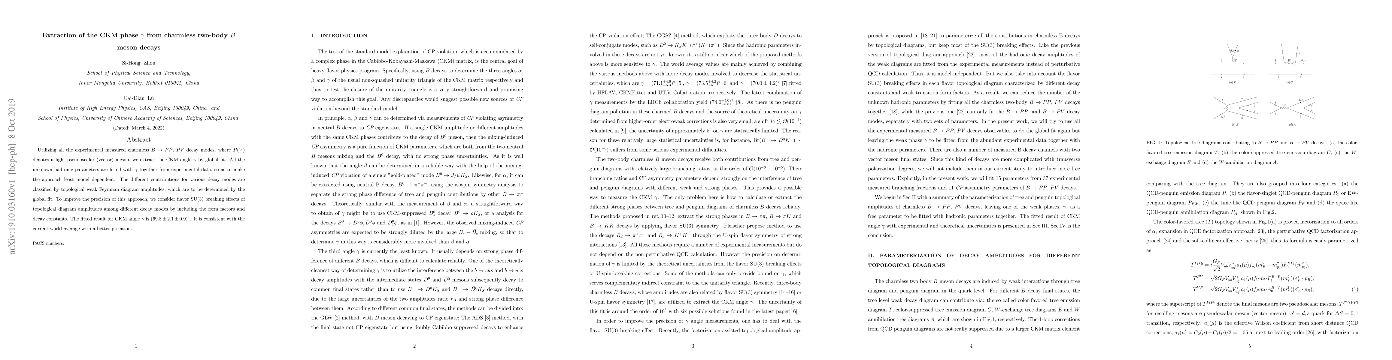 Utilizing all the experimental measured charmless $B \to PP$, $PV$ decay modes, where $P(V)$ denotes a light pseudoscalar (vector) meson, we extract the CKM angle $\gamma$ by global fit. All the unknown hadronic parameters are fitted with $\gamma$ together from experimental data, so as to make the approach least model dependent. The different contributions for various decay modes are classified by topological weak Feynman diagram amplitudes, which are to be determined by the global fit. To improve the precision of this approach, we consider flavor SU(3) breaking effects of topological diagram amplitudes among different decay modes by including the form factors and decay constants. The fitted result for CKM angle $\gamma$ is $(69.8 \pm 2.1 \pm 0.9) ^{\degree}$. It is consistent with the current world average with a better precision.