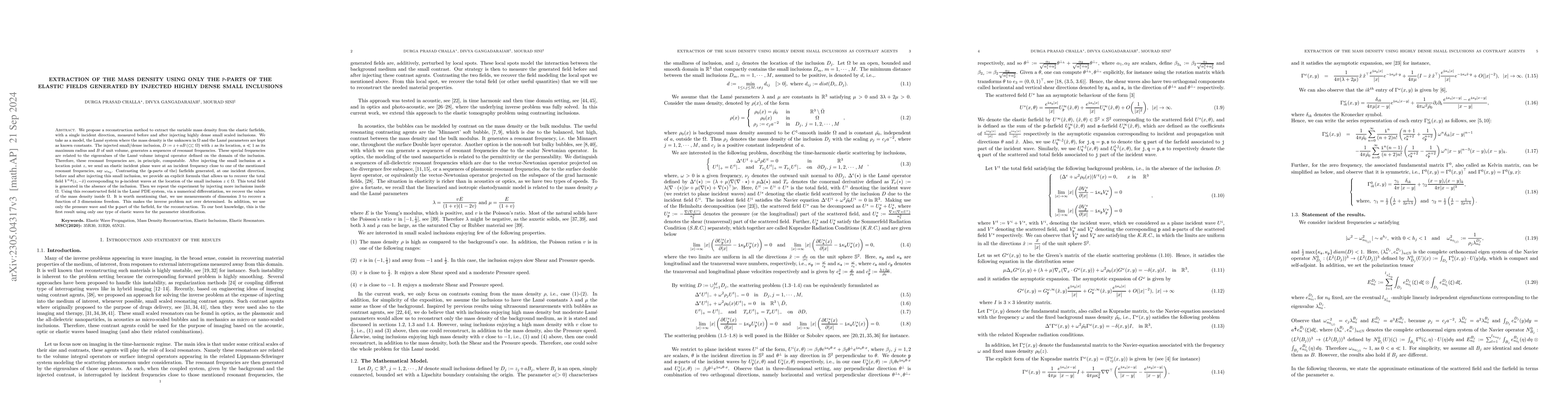 This paper proposes a reconstruction method to extract the variable mass density from elastic far-fields by injecting highly dense small inclusions and analyzing the resulting resonant frequencies. The method uses the difference in farfields before and after the inclusion's injection to recover the mass density distribution within the domain.