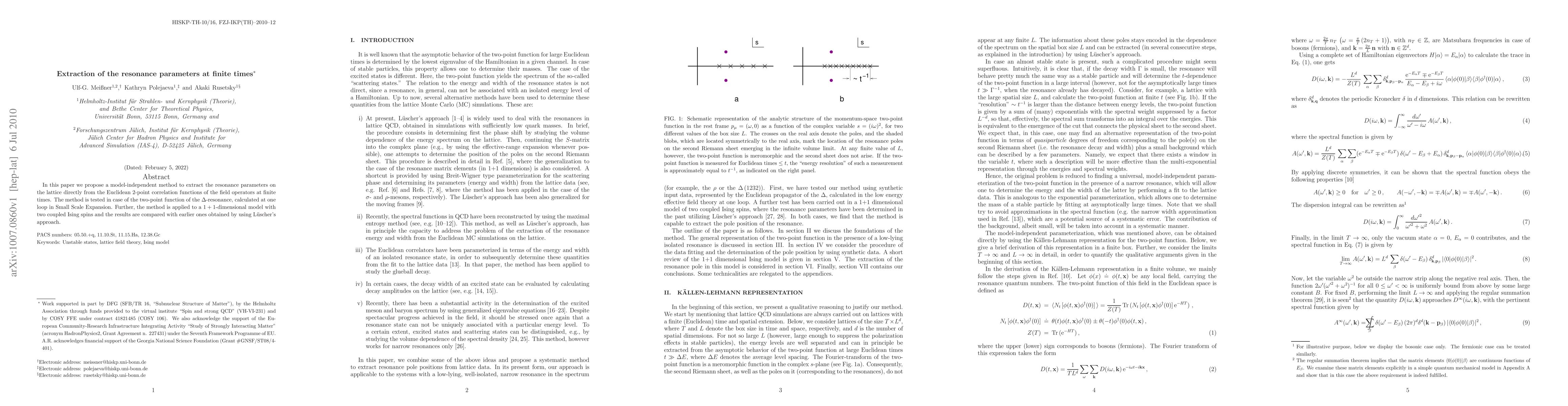 In this paper we propose a model-independent method to extract the resonance parameters on the lattice directly from the Euclidean 2-point correlation functions of the field operators at finite times. The method is tested in case of the two-point function of the Delta-resonance, calculated at one loop in Small Scale Expansion. Further, the method is applied to a 1+1-dimensional model with two coupled Ising spins and the results are compared with earlier ones obtained by using Luescher's approach.