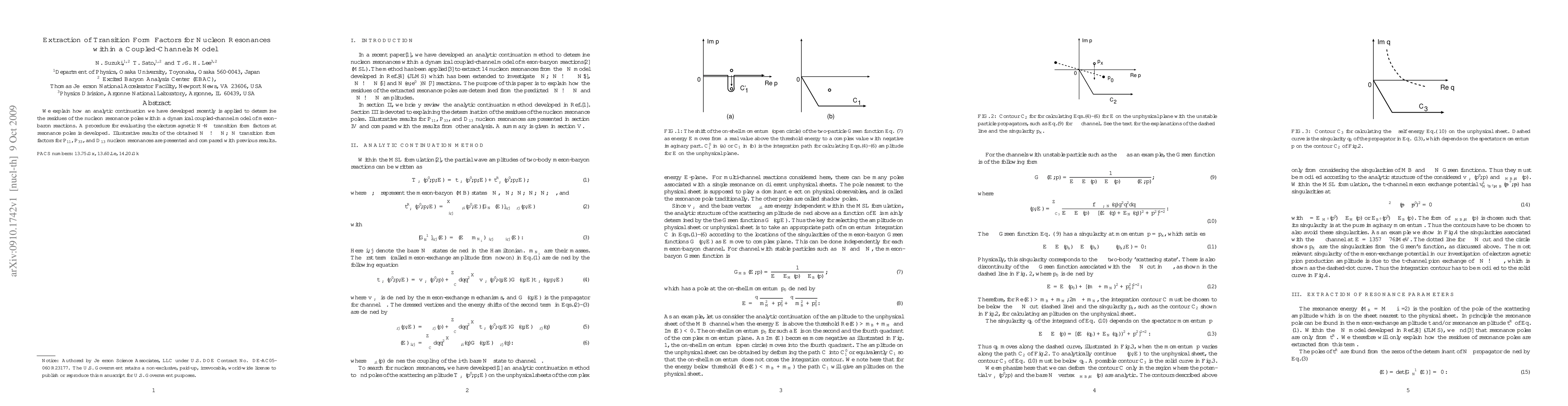 We explain how an analytic continuation we have developed recently is applied to determine the residues of the nucleon resonance poles within a dynamical coupled-channel model of meson-baron reactions. A procedure for evaluating the electromagnetic N-N^* transition form factors at resonance poles is developed. Illustrative results of the obtained N^* -> pi N, gamma N transition form factors for P_{11}, P_{33}, and D_{13} nucleon resonances are presented and compared with previous results.