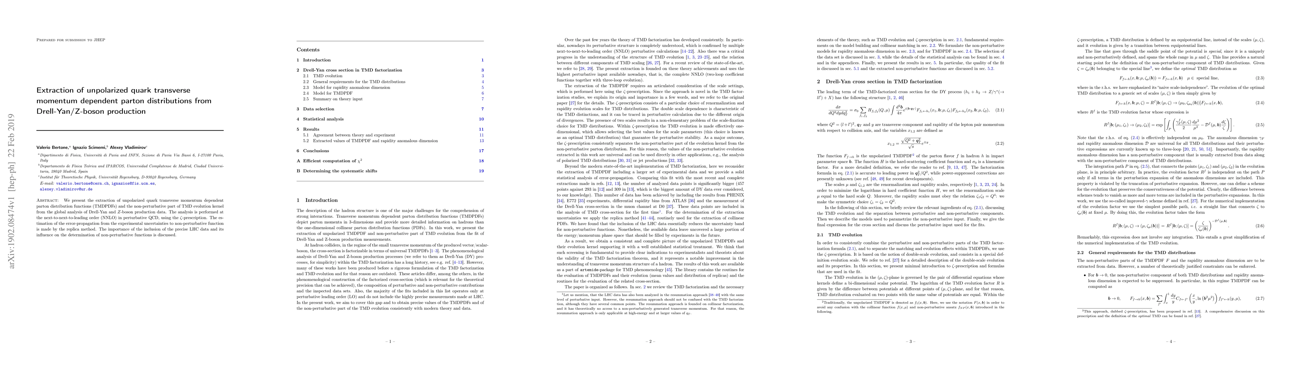 We present the extraction of unpolarized quark transverse momentum dependent parton distribution functions (TMDPDFs) and the non-perturbative part of TMD evolution kernel from the global analysis of Drell-Yan and $Z$-boson production data. The analysis is performed at the next-to-next-to-leading order (NNLO) in perturbative QCD, using the $\zeta$-prescription. The estimation of the error-propagation from the experimental uncertainties to non-perturbative function is made by the replica method. The importance of the inclusion of the precise LHC data and its influence on the determination of non-perturbative functions is discussed.