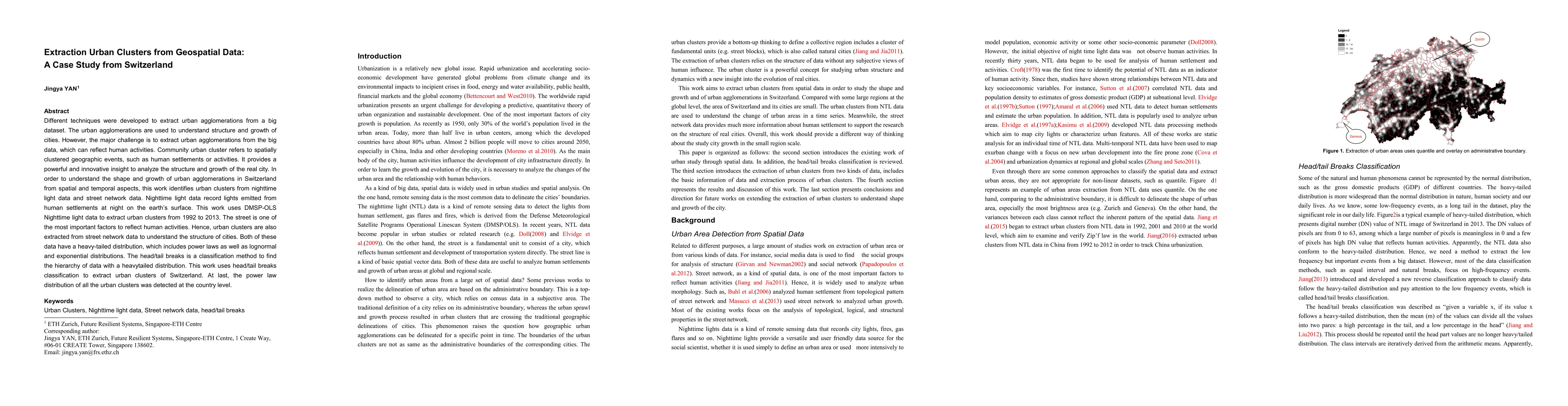 This research extracts urban clusters from Switzerland's geospatial data, using nighttime light data and street network data from 1992 to 2013. It employs head/tail breaks classification due to the heavy-tailed distribution of these datasets, revealing a power law pattern in urban clustering at the country level.